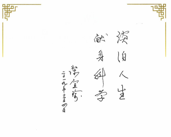 讲座后,陈宜瑜院士也对学弟学妹们写下了寄语:“淡泊人生、献身科学”。
