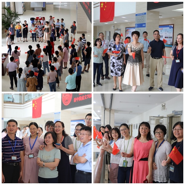 9月30日下午,学院在B栋大厅举行“喜迎国庆,庆祝歌唱比赛佳绩”的庆祝会。学院教职工欢聚在一起,共同观看29日的比赛视频,为合唱队精神饱满的状态、强有力的歌声点赞。当《我和我的祖国》熟悉的旋律响起,入选首批全国高校“双带头人”教师党支部书记工作室的生物医学系党支部书记吴乔教授即兴组织在场的教职工,开展了歌唱《我和我的祖国》的快闪活动。大家挥动起小红旗,把对祖国最深沉的爱融入深情的歌声中,优美的旋律、动人的歌词,充分表达了学院教职工对祖国的深情与热爱,抒发了身为中国人的骄傲与自豪,展现了用奋斗的昂扬姿态报效祖国的决心,为祖国70华诞献上了最真挚的祝福。
