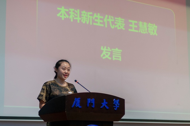 紧接着,王慧敏同学、任心怡同学分别代表本科生新生、研究生新生发言。来自遥远的内蒙古自治区的王慧敏同学真挚地表达了自己通过中学阶段的努力考入厦大生科院、实现梦想的欣喜,并表示,在大学这一全新的环境和人生的新阶段中,自己将会立下新的目标并继续不懈奋斗。任心怡同学则表示,能够进入厦大生科院学习是对本科阶段能力的印证,也是对下一阶段的学习与科研提出了更高的要求。她希望,全体研究生同学能够注重学术诚信,不断提高自身能力,以独立、创新、务实、求真的态度对待科研工作。