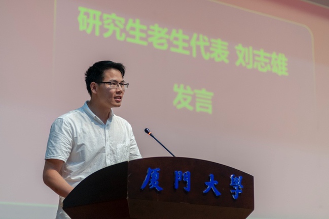 教师代表张宸崧教授用风趣幽默的语言,传达了对同学们的期望和祝愿。他提到,自己在厦大生科院学习、工作了十三年之久,在学院的悉心培养下由一名懵懂的新生成长为了教授,也见证了学院的不断发展。在他看来,厦大生科院的学习科研资源与条件,不输给任何一所国内外高校。他希望新生同学们能做到既“激情一点”又“淡定一点”,既要在学院的支持下埋头苦干、保持科研热情,又要有潜心治学的定力和不忘初心的坚持。