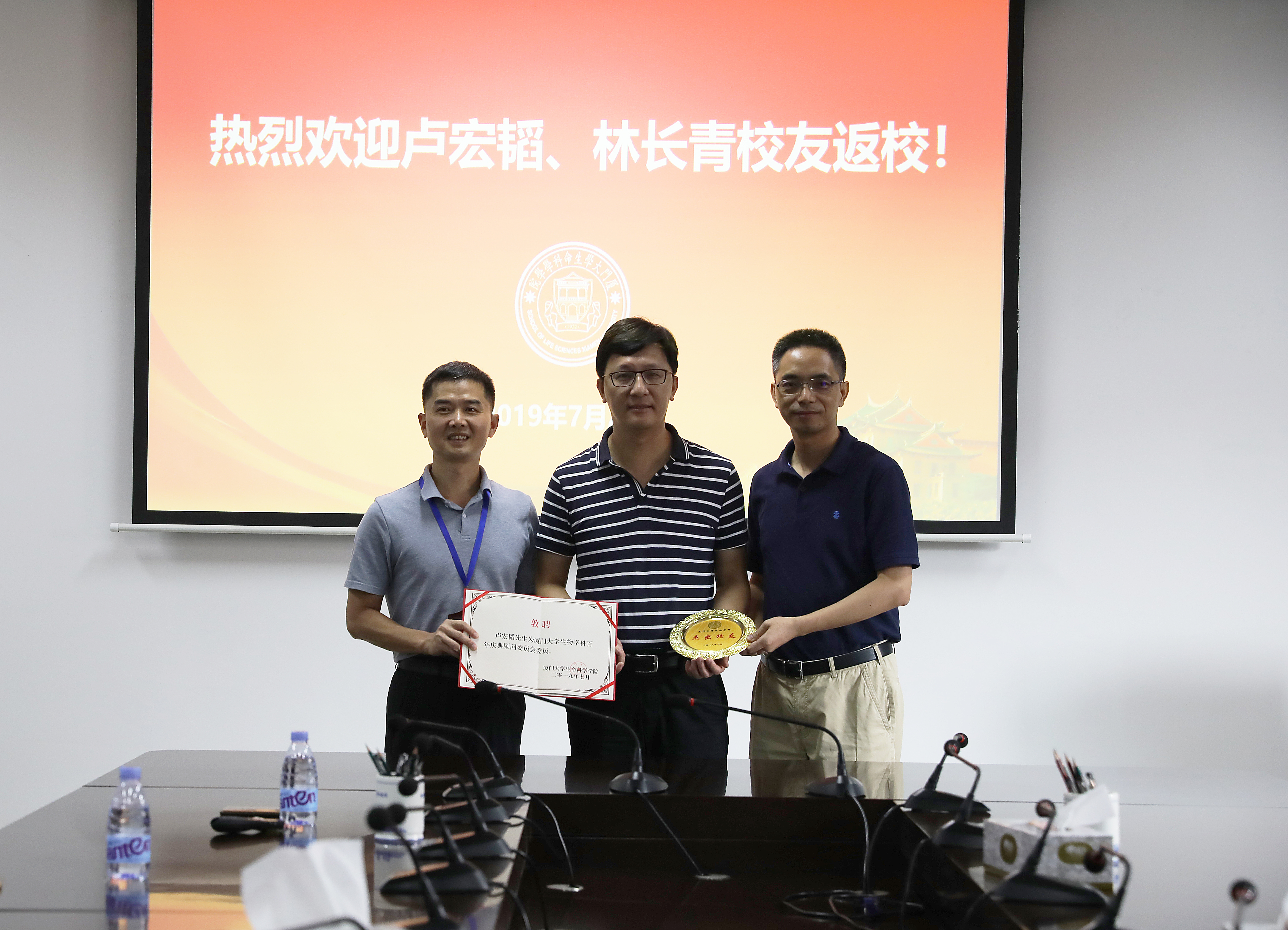 借出席“杰出校友论坛”之机,学院为卢宏韬、林长青校友颁发了“厦门大学生物学科杰出校友”奖牌,聘任为厦门大学生物学科百年庆典顾问委员会委员。两位校友表示将为学院事业发展和校友工作贡献自己的力量。
