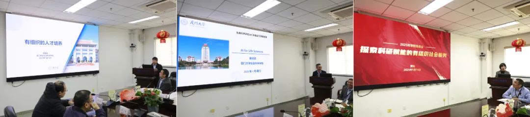 副院长李勤喜从强化本科人才培养、推进研究生分类培养、优化教学资源的共享共建、本研教学成果奖培育等方面,提出了对于做好“有组织人才培养”工作的思考。他指出,紧跟时代发展持续深化教育教学综合改革提升立德树人能力是当前学院的重点工作任务之一,要坚持系统观念,勇于改革创新,开展有组织育人,不断提升学院人才培养质量。副院长黄烯以《探索科研赋能的有组织社会服务》为题作报告,她通过一系列翔实的数据,全面深入地分析了学院2024年科研工作开展情况,并细致阐述了对学院产学研工作、专业学位硕博士点建设、科研团队建设等方面工作的思考,并从组织模式、创新生态、外事合作等方向提出了探索有组织社会服务的路径和针对性举措。遗传与发育生物学系主任黄佳良以“AI for Life Sciences”为主题,介绍了人工智能与生命科学之间的联系,并通过报告向大家说明,人工智能正在帮助拓展生命科学研究的边界、驱动生命科学研究范式转型。他表示,生命科学领域的科研人员要用好人工智能这个工具,瞄准国际科技前沿和国家重大需求,开展有组织科研。每场专题报告结束后,与会人员结合报告内容,联系学院和自身工作实际开展研讨,重点围绕人才培养、团队建设、学科建设等问题踊跃发言、献计献策。