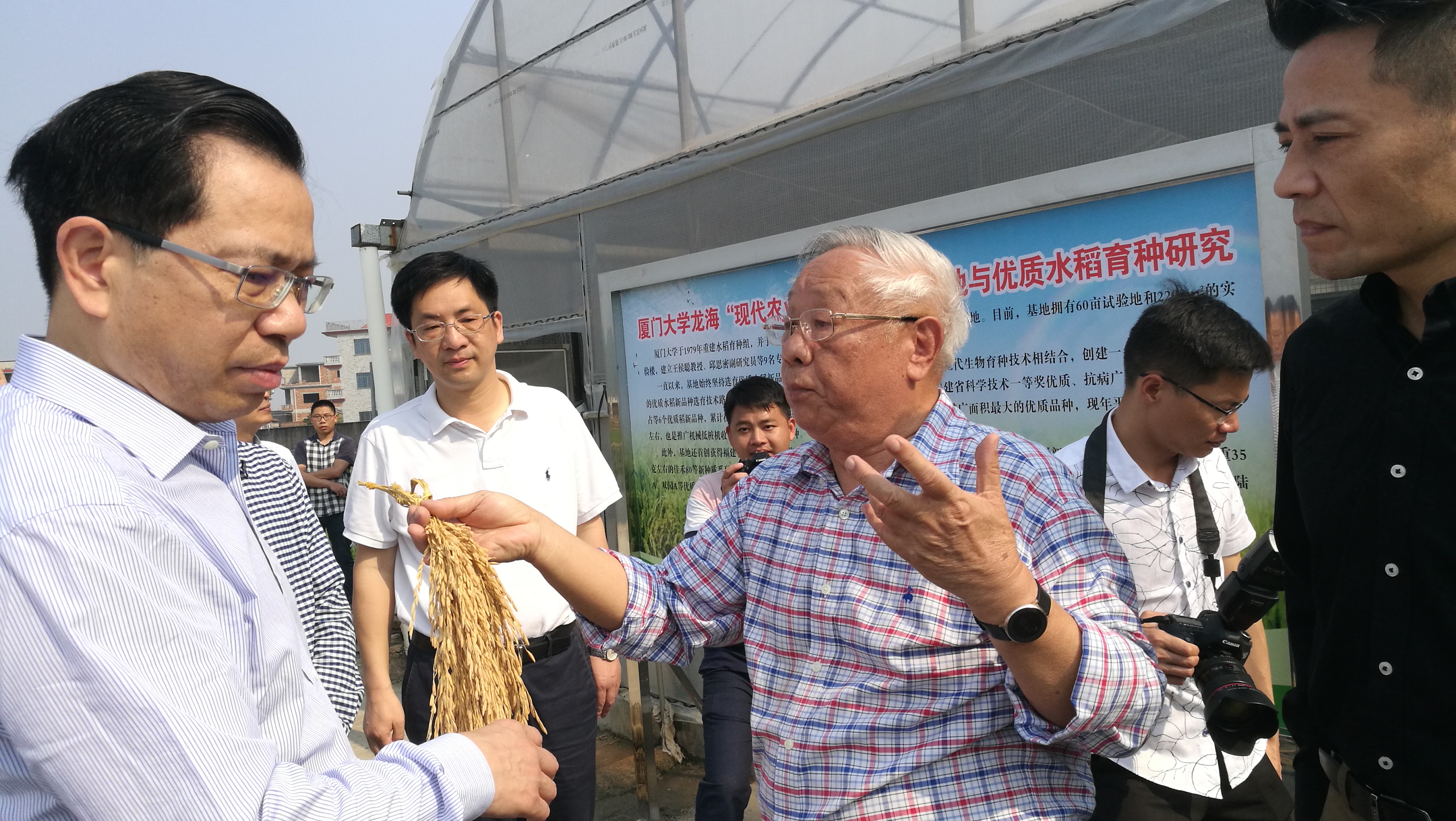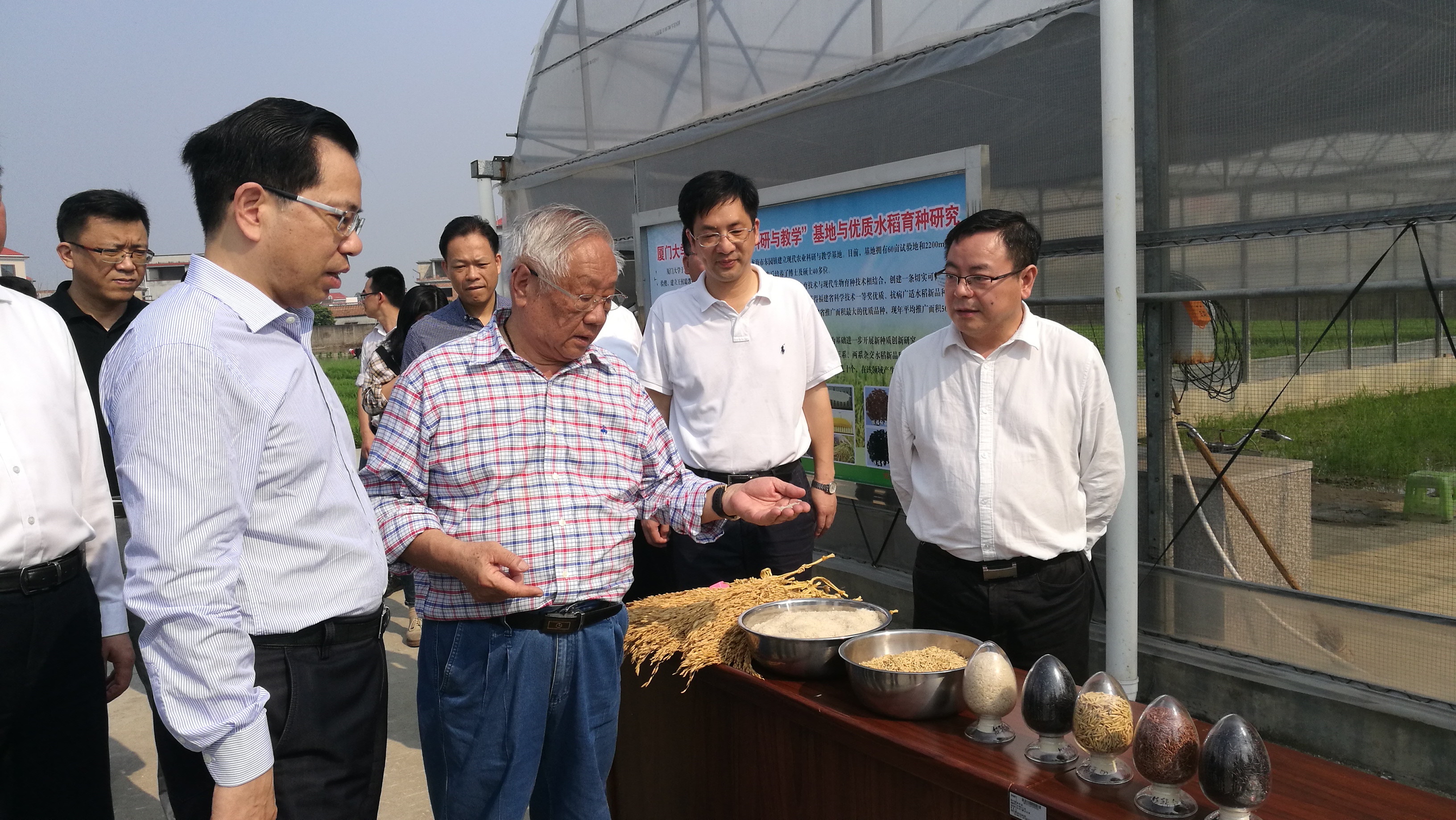 基地负责人王候聪教授向邵玉龙书记介绍了基地的建设发展和他40年的水稻育种历程。王教授虽年逾八旬,依然带领团队奋战在优质水稻新品种研发一线。他带领团队呕心沥血,在没有优质种质资源、技术人员及研究经费缺乏的情况下,克服重重困难,经过多年艰苦努力,取得了丰硕的研究成果,先后育成“乌珍1号”、“佳禾7号”、“佳禾5号”、“佳禾早占”、“南厦060”、“佳辐占”等优质水稻品种并大面积推广应用,创造了巨大的社会经济效益,同时也填补了福建省常规优质早稻的空白。邵玉龙对王教授团队久久为功研发良种的精神和取得的成果表示赞赏,他指出,种子是粮食生产的“内核”,种子好不好,决定了粮食的产量和品质,要继续用好农业科研平台,不断研发培育推广更多优良种苗,辐射带动地方农业发展,造福更多百姓。李博安副院长介绍了学将进一步加强农业生物技术研究的支持力度和思路方案,期待能与漳州市政府开展全方位的共建合作,深入贯彻国家乡村振兴战略,助力漳州市现代农业提质增效,促进农业高质量发展。