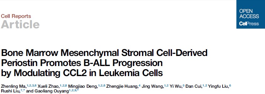 2月5日,我院欧阳高亮教授课题组在Cell Reports上发表了题为“Bone Marrow Mesenchymal Stromal Cell-Derived Periostin Promotes B-ALL Progression by Modulating CCL2 in Leukemia Cells”的研究论文,揭示了细胞外基质蛋白POSTN调控B-ALL发生发展的分子机制。