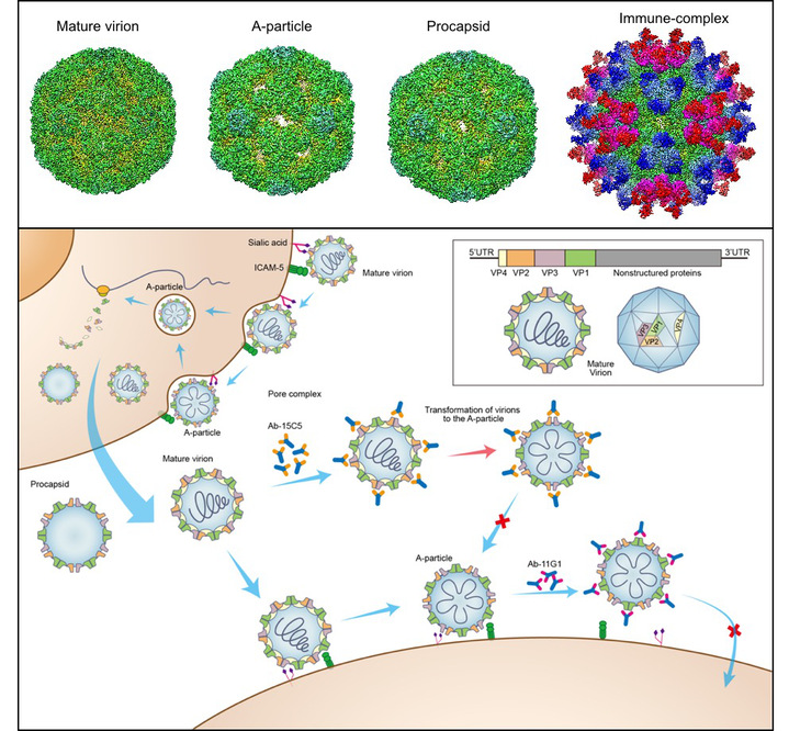 该研究通过解析肠道病毒D组68型(EV-D68)不同类型病毒颗粒及其免疫复合物的高分辨率结构,系统阐明了EV-D68病毒的生活周期及各时期的病毒中和机制,进一步完善了小RNA病毒的吸附入胞及感染机制理论,为EV-D68新型疫苗、抗病毒治疗药物的研发提供重要的理论指导。EV-D68病毒主要感染人群为免疫力低下的儿童及婴幼儿,引起呼吸道疾病,严重时可导致哮喘、肺炎、支气管炎等,甚至死亡。EV-D68病毒于1962年首次从被感染儿童的呼吸道中分离获得。2014年,北美暴发EV-D68病毒流行,造成1153人感染,并致14人死亡。此后该病毒在全球散发流行,至今仍无相应的治疗性药物和疫苗上市,造成了较大的公共卫生负担。目前针对该病毒的基础病毒学研究及其优势中和表位研究尚不全面,严重制约了相应药物和疫苗研究的有效开展。