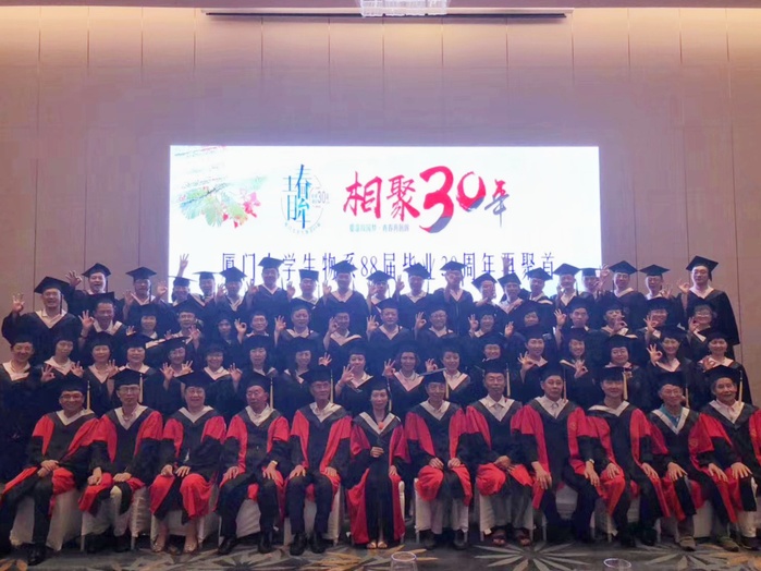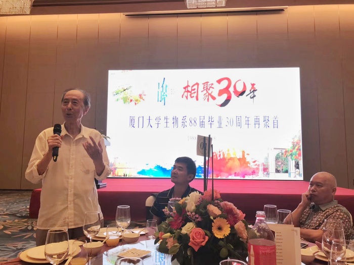 随后,校友们在康莱德酒店举行“相聚30年——重温校园梦、青春再回眸”的交流联欢会。学院党委书记张明智、副院长欧阳高亮教授、副院长左正宏教授、党委副书记葛郝锐和党委副书记葛学凤参加了活动。张明智书记代表学院致辞,欢迎84级校友重返母校,母校和学院以他们为荣。他表示,学院96年的发展离不开广大校友的支持,希望校友们一如既往地关心支持学院的建设和发展,与学院师生员工携手一道,共建一流生科,实现厦大生科人世界一流的生科梦。欧阳高亮教授为校友们介绍了学院近年的发展情况,包括在学科建设、人才培养和科学研究等方面所取得的显著成绩。
