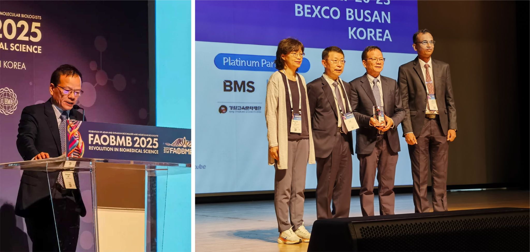 2025年5月20日下午,我院林圣彩院士应邀出席第31届亚洲及大洋洲生物化学家与分子生物学家联盟(FAOBMB)国际学术会议(FAOBMB 2025-REVOLUTION IN BIOMEDICAL SCIENCE),本届会议在韩国釜山举行。开幕式上FAOBMB主席向林院士颁发了2025年度卓越研究奖(FAOBMB Award for Research Excellence 2025)。颁奖仪式后,林院士作大会主旨报告,题为“葡萄糖感应与生理功能”(Glucose Sensing and Physiological Functions),向与会学者分享其团队在葡萄糖代谢调控领域里程碑式的成果。