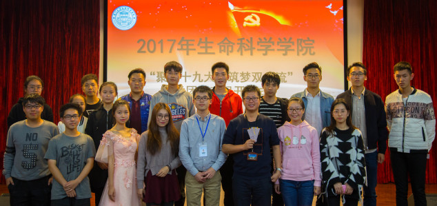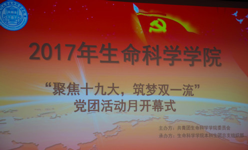 2017年12月4日晚,为庆祝中国共产党第十九次全国代表大会胜利召开,深入学习贯彻党的十九大精神,进一步激励学生团支部和学生党员、共青团员在推动学校、学院“双一流”建设中奉献青春力量,将党团精神与大学认同感传递到新一代青年身上,学院团委以“聚焦党的十九大,筑梦“双一流”为主题的党团活动月开幕式于黄朝阳楼五楼报告厅举行。生命科学学院党委副书记张伟老师,团委书记毛毛老师,辅导员吴佳蓓老师、江子扬老师、黄劲夫老师出席开幕式。生命科学学院2017级本科生何婧嘉主持开幕式。