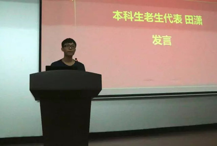 随后发言的是本科生老生代表2014级田潇同学,他回顾了过去3年间丰富多彩的大学生活,对老师们的辛勤付出与培养表示感谢,并祝愿每一位新生都能够拥有一个精彩纷呈的未来和一段终身回味的厦门大学生涯。