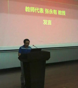 接着教师代表张永有教授作了发言,他向新生提出了三个建议。第一,尽早确定人生的目标,目标是人生的基础;第二,他希望大家能够做出科学的规划,通过规划并实现一系列切实可行的小目标为最终目标奠定基础;第三,为目标规划努力奋斗,奋斗的青春是最亮丽的。张永有老师特别指出,游戏可以作为课余时间的休闲与调节,但是绝对不能过度沉迷;希望大家能够抓住时代的机遇,以不平凡的业绩成就自己的卓越人生。
