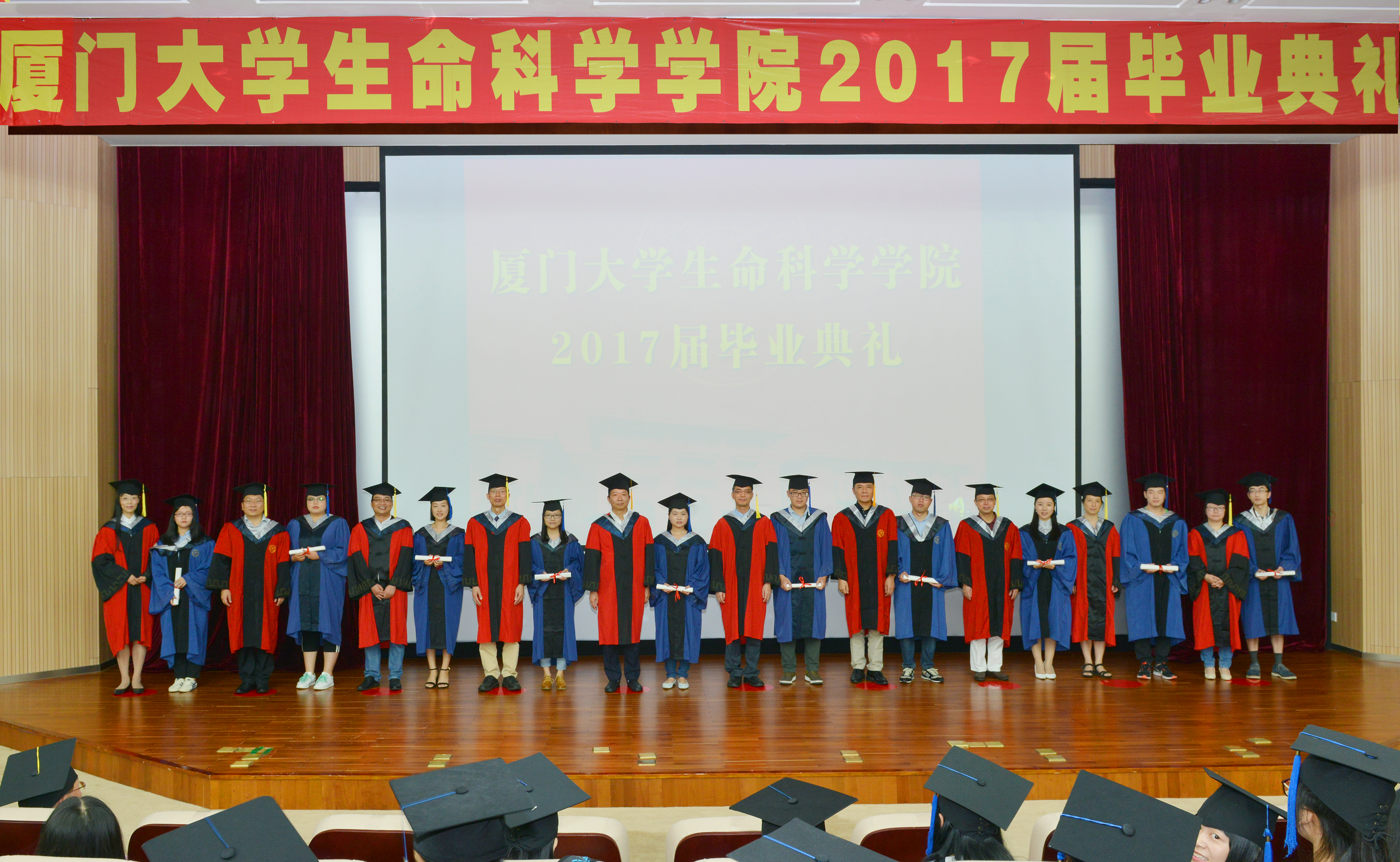 6月15日下午,学院2017届毕业典礼在翔安校区图书馆报告厅隆重举行。太龙(福建)商业照明股份有限公司副总经理、我院86级校友黄国荣先生,厦门大学校长助理,翔安校区党工委书记、管委会主任,生命科学学院党委书记陈光,院长周大旺教授等党政领导,学院教授委员会,本科毕业班班主任,教学秘书和辅导员,以及2017届全体毕业生与部分学生家长出席了典礼。典礼由副院长李勤喜教授主持。