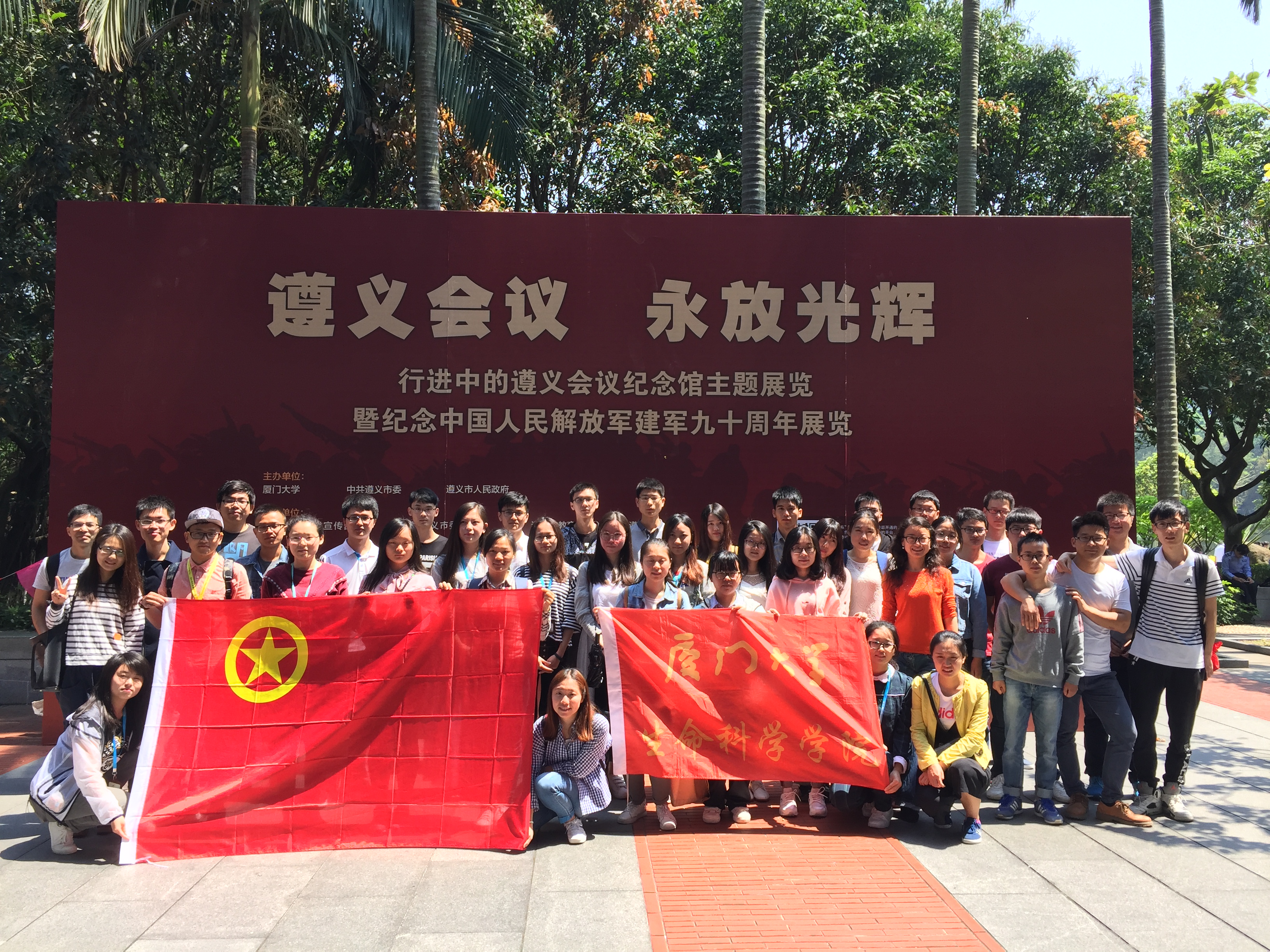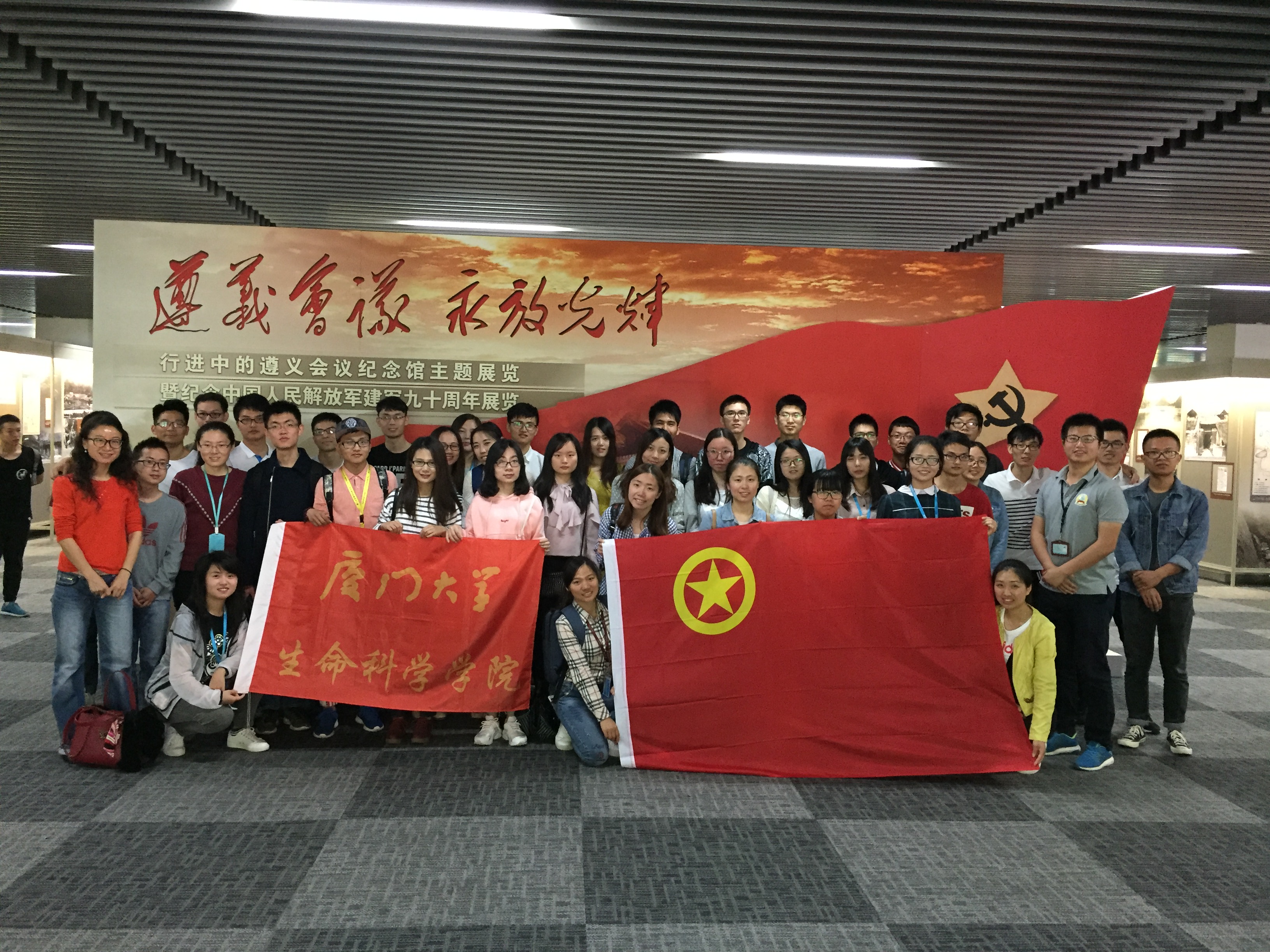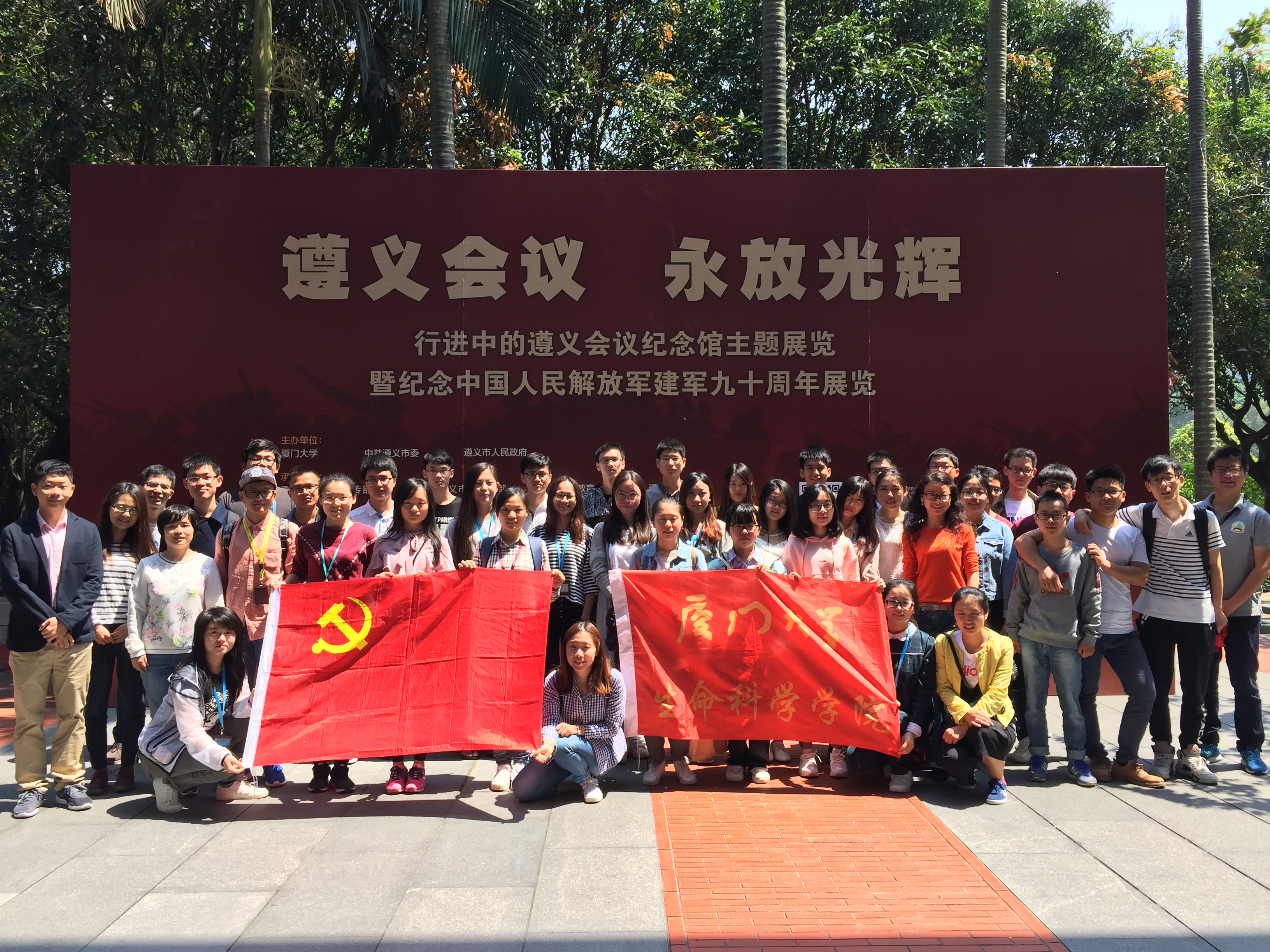 “苗岭秀,旭日升。 百鸟啼,报新春。遵义会议放光辉”。1935年召开的遵义会议成为党的历史上一个生死攸关的转折点。”4月29日上午,为深入开展“两学一做”学习教育,深入了解长征及遵义会议历史,进一步坚定学生党员理想信念,激发爱国热情,由生命科学学院党委副书记张伟,党务秘书、辅导员、学生党支部书记、支部委员、团支部书记一行50人参观由中共遵义市委、市政府和厦门大学主办的“遵义会议,永放光辉——行进中的遵义会议纪念馆主题展览暨庆祝中国人民解放军建军九十周年厦门大学行”活动,与革命先辈们进行了一场跨越时空的对话。