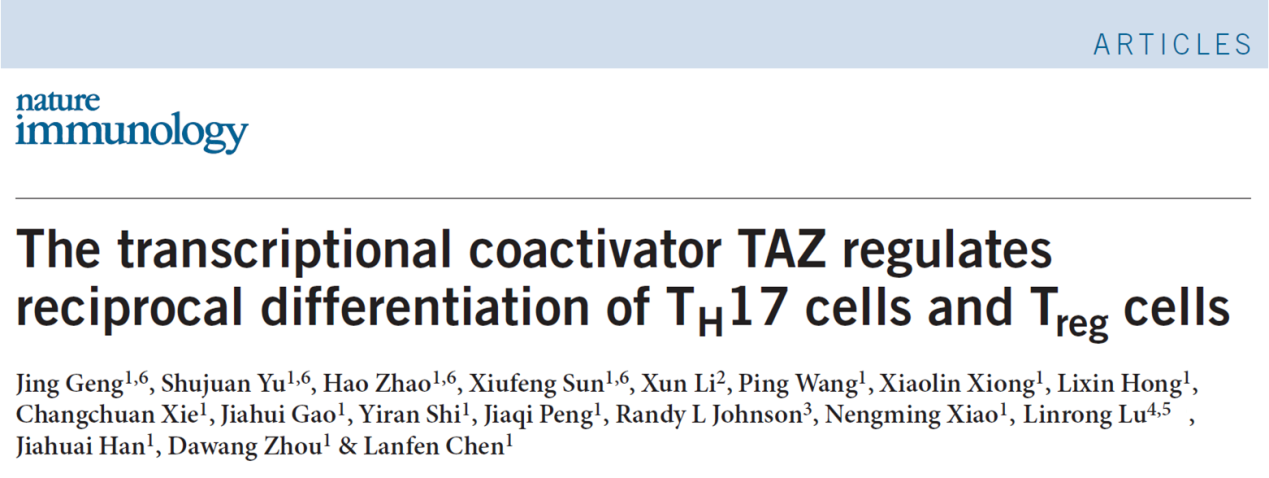 本项研究阐明了TAZ在调节CD4+初始T细胞分化为TH17细胞和Treg细胞的过程中发挥着关键调控作用及其重要机理。该项研究对多种自身免疫性疾病的发病机理提供理论依据,也为早期诊断和治疗慢性炎症性疾病提供可能的分子标志物和治疗靶标。本篇论文的主要工作由博士后耿晶、博士生余淑娟、赵昊和孙秀峰等学生共同承担,并与厦门大学附属第一医院、浙江大学、美国德克萨斯大学等单位合作完成,通讯作者为陈兰芬教授和周大旺教授。该研究工作获得了国家自然科学基金委、国家重点基础研究发展计划(“973”项目)、中央高校基本科研基金的资助。