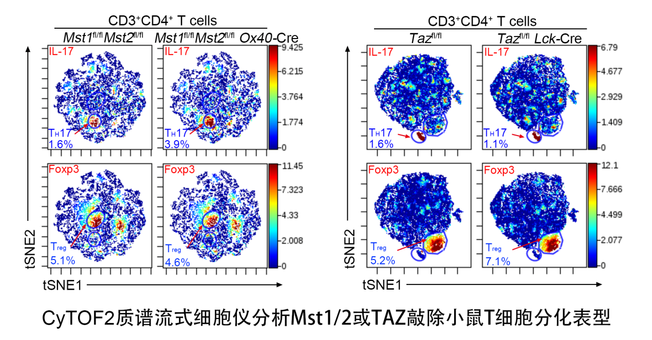 在本项研究中,该团队应用CyTOF2质谱流式细胞仪,针对Hippo信号通路关键成员在T细胞特异性敲除小鼠,利用KLH模型分析发现,与野生型小鼠相比Mst1/2敲除后TH17细胞亚群数量显著上升与之相对应的Treg细胞亚群大量减少;而当被Mst1/2抑制的下游效应分子TAZ敲除后,这两类亚群细胞数量呈现相反的变化。进一步研究发现,CD4+初始T细胞分化为促进炎症的TH17效应细胞过程中TAZ表达显著上调,更重要的是通过分析类风湿性关节炎和干燥综合征病人的外周血记忆性T细胞后发现,TAZ与TH17细胞的核心转录因子RORyt的表达呈正相关。这说明TAZ的大量表达对于促进TH17细胞的分化及其介导的炎症性疾病的发生十分重要。