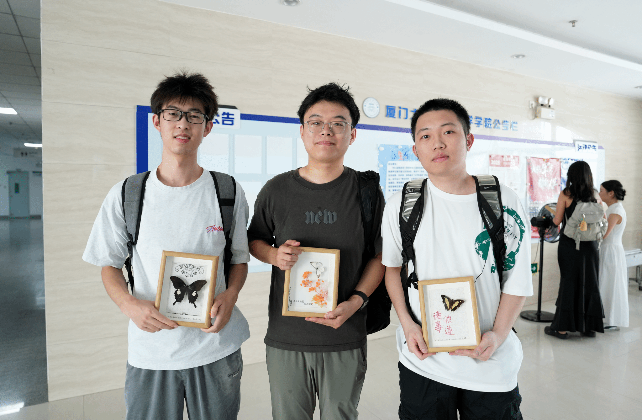 毕业欢送会上,当2025届毕业生接过这份独一无二的毕业礼物时,惊喜与感动溢于言表。“这份礼物太珍贵了!每一个细节都能看出老师和学弟学妹们的用心,它不仅是一件精美的艺术品,更承载着我们在学院的美好回忆,是我们继续前行的温暖力量。”毕业生手捧标本,爱不释手。在柔和的灯光映照下,相框里的蝴蝶翅膀泛着绚丽的蓝绿色光泽,旁边是学弟学妹们手写的祝福语,字里行间满是对学长学姐的不舍与祝福:“愿学长学姐如蝴蝶般,在广阔天地间自由翱翔,追逐梦想”。这些独一无二的礼物,成为了毕业生们青春记忆中独特而珍贵的注脚,也将伴随他们在未来的日子里,每当看到这份标本,就能回想起在厦门大学生命科学学院度过的美好时光,汲取继续前行的力量。
