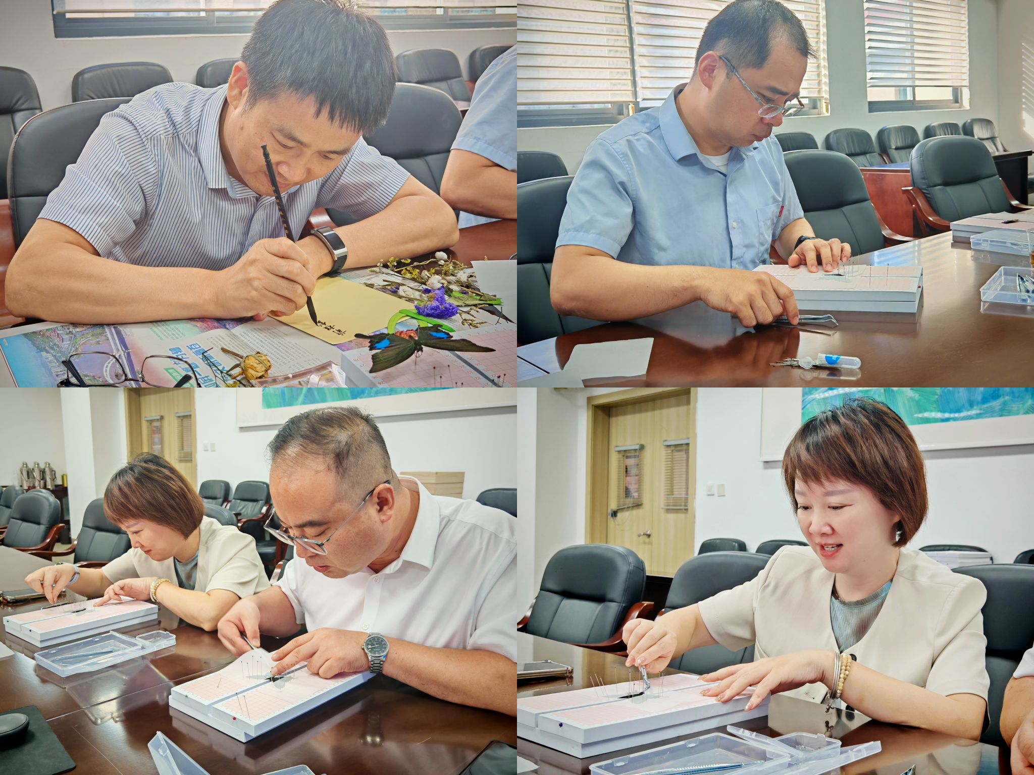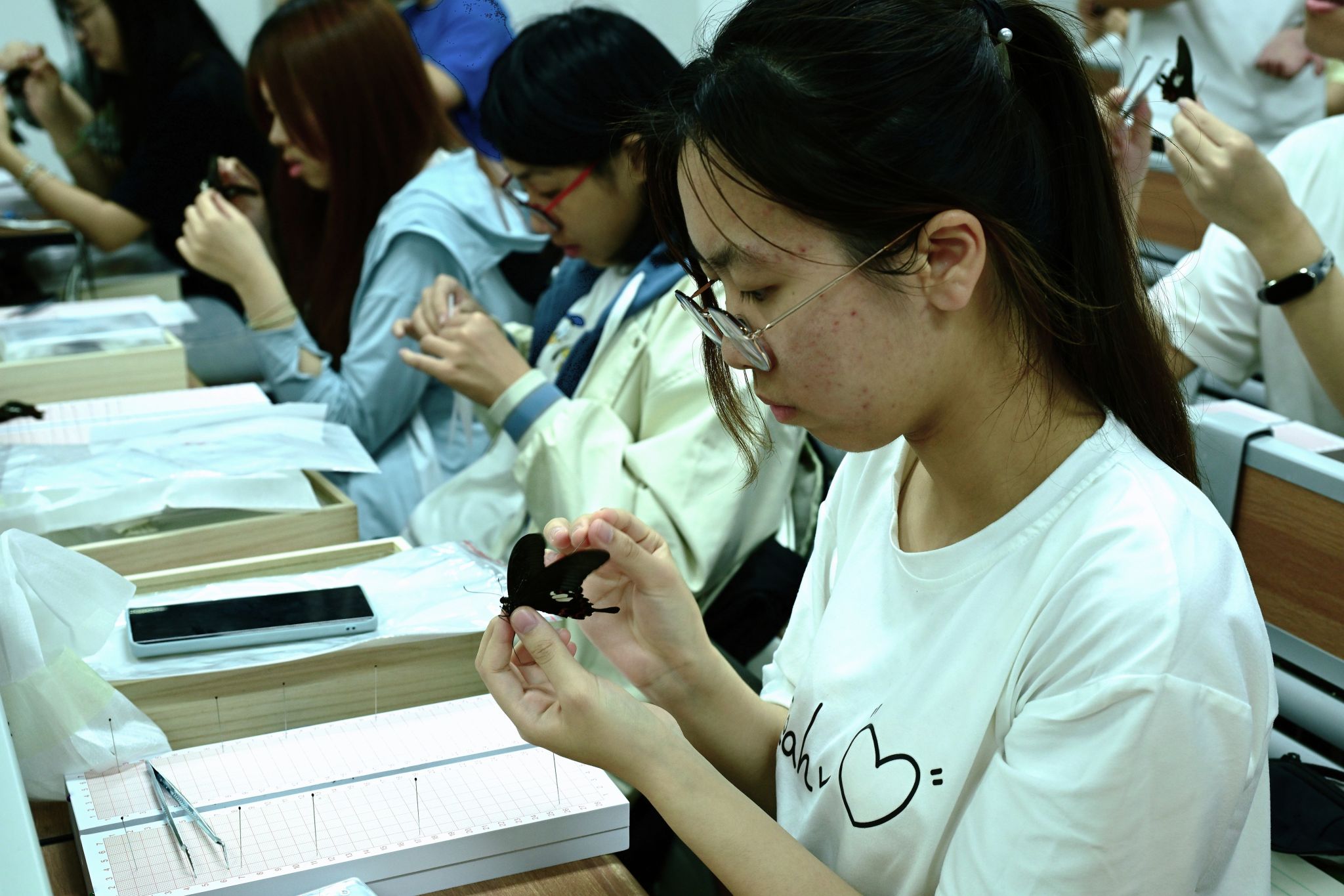课程聚焦“生物标本制作与创意设计”,引导学生在实践中感悟劳动之美、探索科学之妙。“从蝴蝶采集、展翅定型,到融入创意设计,每一步都像在完成严谨的科学实验。”李同学在作品上郑重签下姓名时,分享着课程收获。在制作过程中,学生们还会定期开展小组讨论,互相分享创意灵感,教师们也会适时给予指导,帮助学生突破创作瓶颈,在这个过程中,团队协作精神与创新思维也得到了充分培养。