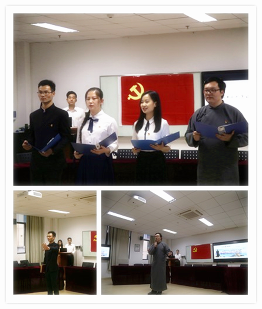 恰同学少年,风华正茂;书生意气,挥斥方遒……”在一曲悠扬的配乐声中,来自本科生第一党支部的党员向新楚身着麻布长衫,深情地朗诵了毛泽东同志32岁离开故乡韶山时所作的《沁园春•长沙》。之后,其他党员又分别朗读了周恩来同志的《送蓬仙兄返里有感》,以及习近平总书记37岁时任福州市委书记所作的《念奴娇•追思焦裕禄》。演绎经典名篇,回顾历史岁月。活动借鉴央视最近热播节目《朗读者》的形式,通过诵读党和国家领导人的在青年和成长时期写下的著名诗篇,抒发和体会伟人救国救民、为国立功的远大志向以及国家领导人执政为民、造福百姓的远大抱负与宏愿。