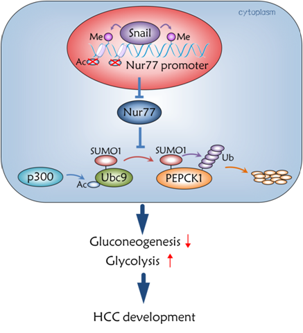 在这项研究中,研究人员首先利用DEN/CCl4和STZ/HFD两种肝癌诱导的小鼠模型(野生型和Nur77敲除型小鼠)发现了Nur77能够显著地抑制肝癌的发生和发展。临床样品检测和统计分析也提示随着肝癌的恶性程度增高,Nur77表达呈明显的下调趋势,且与肝癌患者的预后正相关。在随后的机制研究中通过质谱分析找到了与Nur77相互作用的关键蛋白-- PEPCK1。PEPCK1是糖异生通路中的一个重要限速酶,在肝癌的发生发展中也发挥抑制作用。但是无论在临床肝癌样品还是体外培养的肝癌细胞中PEPCK1均呈低表达水平,这是由于PEPCK1在124位赖氨酸位点发生了SUMO化修饰,导致蛋白的稳定性降低,并通过泛素-蛋白酶体途径降解。同时,在肝癌中乙酰化酶p300高水平表达,它可以通过乙酰化Ubc9加强其与PEPCK1结合以提高PEPCK1的SUMO化水平,从而促进PEPCK1降解,最终导致糖异生的下调和糖酵解的升高,加速肝癌细胞增殖。然而,Nur77表达不仅抑制了p300对Ubc9的乙酰化,同时也阻断了p300与PEPCK1的结合,从而削弱PEPCK1的SUMO化,稳定其蛋白水平,由此增强糖异生、抑制糖酵解。但是,在肝癌发生发展过程中,由于Nur77启动子发生甲基化,导致其基因和蛋白表达下调,从而无法发挥抑制PEPCK1的 SUMO化及其蛋白降解的功能。所以,抑制PEPCK1的SUMO化和提高Nur77的表达水平为肝癌治疗提供了一个新方向。