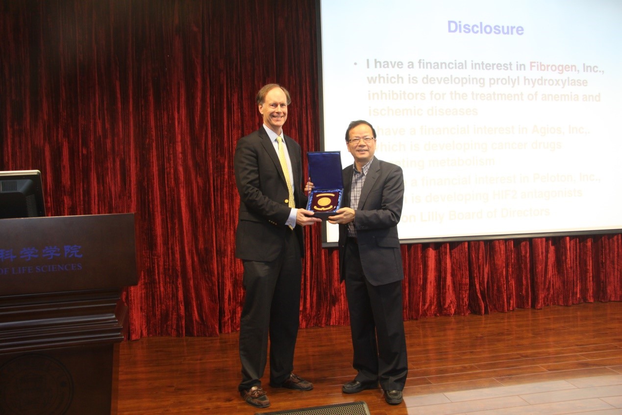 11月4日上午,受我院林圣彩教授、李晓彤教授的邀请,荣获今年拉斯科大奖(该奖项被誉为“诺贝尔奖风向标”)的美国科学院和医学院院士,哈佛大学教授,霍华德•休斯医学研究所研究员,现任美国国家癌症研究所科学顾问委员会委员、美国国家医学癌症政策委员会委员、美国癌症研究协会董事会董事等要职的William Kaelin博士在生命科学学院五楼学术报告厅为我院师生带来了一场题为“The VHL Tumor Suppressor Protein: Insights into Oxygen Sensing and Cancer Metabolism”的南强学术讲座。林圣彩教授主持了本场讲座,并为Kaelin博士颁发了南强学术讲座纪念章。
