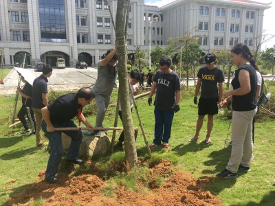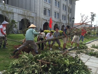 15日上午7时,风雨减弱后,学院立即布置灾后恢复重建工作,以最快的速度,把“莫兰蒂”对教学科研造成的不良影响降到最低。学院指示物业修复了受损大门,组织值守人员清理学院大楼内部公共区域,还原了干净整洁的面貌;办公室初步检查统计学院大楼外部受损情况,借助微信平台向学院师生通报灾情,布置各课题组尽快统计上报受损情况;居住翔安校区附近的课题组负责人以及研究生陆续赶回实验室,清理实验室积水、打扫卫生。为避免长时间断电对生物材料造成不可逆转的影响,学院组织相关课题组同学将学院五楼动物观察室的1500笼小鼠及时搬至通风处,进行人工换气,抢救了科研小鼠的生命;转移部分断电的超低温冰箱内的重要实验物品至液氮罐内,积极联系学校职能部门想方设法给予应急供电。15日下午4时左右,翔安校区恢复供电后,各课题组实验室开始运转,当天晚上,全院灯火通明,各课题组恢复了往日热闹的科研气象。此次台风带来的强风暴雨造成校园大片树木倒地,一片狼藉,16日上午,学院党委发动以党员、学生干部为骨干的志愿者投入美丽校园恢复重建工作。张伟副书记和辅导员带队,组织250余人次本科生和研究生,清理了三栋学生宿舍楼走廊、楼梯等公共空间,扶起宿舍楼被风吹倒的自行车;清理了学院周边折断的树枝、垃圾杂物;打扫了4号楼、5号楼公共走廊卫生,帮助后勤人员重栽4号楼前的树木;协助图书馆转移重要设备,清理环境生态学院楼前马路,为重建美丽校园贡献了生科人的一份力量。
