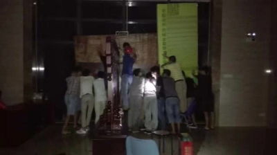 主要领导干部始终坚守一线,实时掌握台风动向,坐镇沉着指挥,坚持带领值守人员来回巡查大楼各个角落;面对重大险情,师生们不顾个人安危,用血肉之躯构筑防线,坚持2小时,成功抵御超强台风对学院大门的正面袭击,守护了学院大楼内部的安全;以韩家淮教授为代表的课题组负责人值守实验室,指导学生应对台风,转移资料和实验仪器,确保了资料和实验仪器及其生物材料的安全;辅导员与学生干部,积极做好防范预警和粮水电的储备,对个别无法紧闭的门窗进行临时加固和封闭,通过手机向同学们传达台风动态与注意事项,及时安抚同学。建筑物防抗台风的关键在于堵住风口,防止台风对室内造成巨大冲击。学院大楼四周多为铝合金玻璃门窗,而大门为玻璃门,一旦玻璃破裂或大门失守,价值上亿元的教学科研仪器及其实验数据、生物材料如果被破坏,后果将不堪设想。虽然学院已于14日晚,对正大门、各层主要侧门共计71扇,用木棍、铁线、沙袋给予加固,严阵以待。然而,随着台风的逐渐逼近,风雨愈发肆虐,15日凌晨2时16分,学院停电,随后,学院大楼侧面数扇铝合金侧门相继被台风冲开,左正宏副书记与值守人员两至三人一组使出全力顶住门框,锁上侧门,绞上铁线,顶上沙袋艰难地排除险情,时刻关注各楼层侧门安全。3时26分,在台风的巨大冲击下,学院玻璃大门门轴上部脱位,造成大门倾斜,风雨疯狂扑进大厅。台风如果攻破大门,形成的穿堂风,将使楼内遭受“灭顶之灾”。值守人员果断扶住大门的同时,陈光书记迅速抽调实验室值守师生前来增援,搬来储备的三块大型木板堵住风口形成第一道防线;就近搬移大厅厚重的实木屏风和值班台顶住木板和大门形成第二道防线;然而,风力一阵阵不断增强,屏风和值班台还不足以抵挡巨大的台风的正面侵袭,木板随时有被掀开的可能,不断赶来支援的师生交替上阵,21位师生轮流用自己的血肉之躯死死地压住木板,顶住风暴,顽强地与“莫兰蒂”抗争搏斗,英勇筑起了第三道防线,使险情得到了缓和,并坚持到5点半左右台风过境减弱,才相继撤离返回各自岗位,成功地把台风拒之门外。