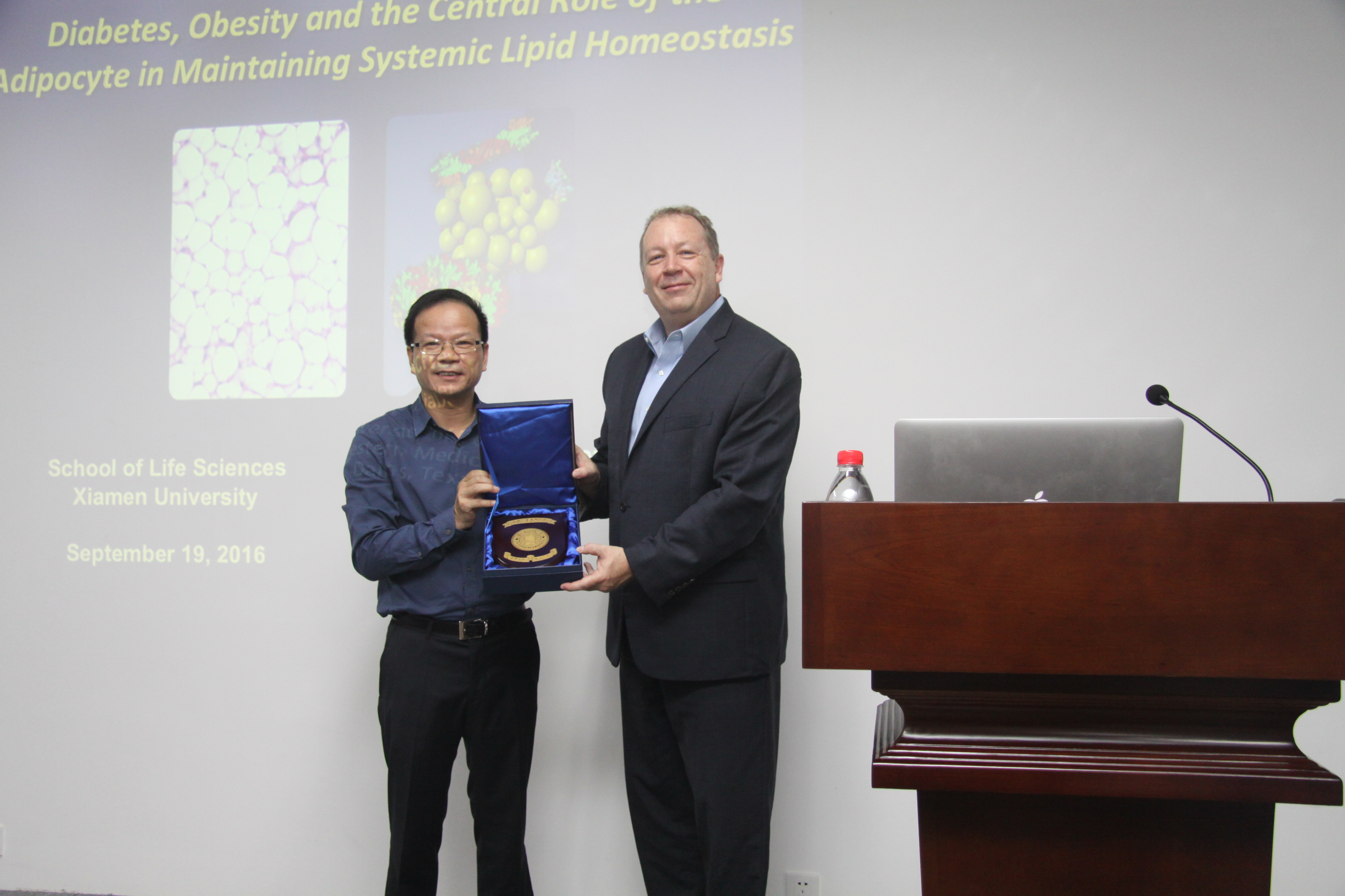 9月19号上午,来自美国德克萨斯大学西南医学中心的Philipp E. Scherer教授在生命科学学院E307报告厅,为全校师生带来了题为“Diabetes,Obersity and The Central Role of the adipocyte in Maintaining Systemic Lipid Homeostasis”的精彩讲座。生命科学学院院长林圣彩教授主持了本场讲座,并为Philipp E. Scherer教授颁发了南强学术讲座纪念章。