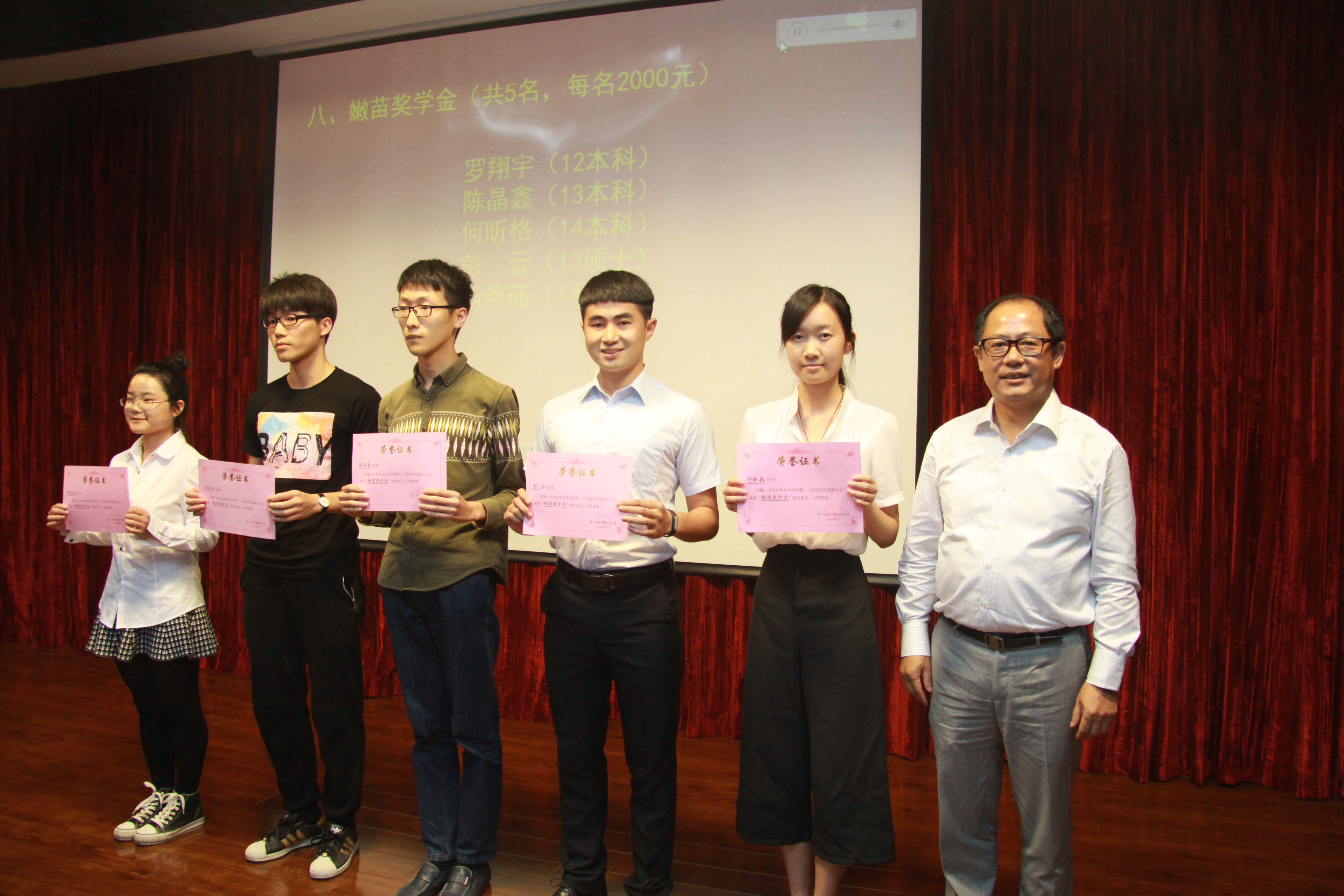 随后进行的,是由各级校友和社会各界人士捐赠的奖学金颁奖,分别由王侯聪教授、翁师德先生和岳永斌先生为黄厚哲-曾亚卿奖学金获得者杨艺等3名同学、嫩苗奖学金获得者罗翔宇等5名同学、久依奖学金获得者苏若鹏等4名同学颁奖;党委书记陈光老师、副院长宋思扬教授、党委副书记张伟老师以及莫玮教授为获得豪客来奖学金获得者向新楚等13名同学、汪德耀奖学金获得者王帅朝等6名同学、景杰奖学金获得者孙秀峰等5名同学、77微专助学奖学金获得者陈淑萍等7名同学、生工科研奖学金获得者朱雁林等3名同学颁奖。
