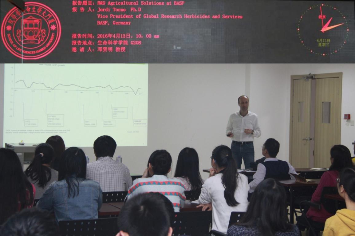4月13日上午,BASF副总裁Jordi Tormo博士和北亚区科技合作部邵奇妙博士访问厦门大学生命科学学院天然产物源靶向药物国家地方联合工程实验室。Tormo博士主要负责BASF的作物保护事业部,他在黄朝阳楼G208给生科院师生带来了一场主题为“R&D Agricultural Solutions at BASF”的交流报告,工程实验室邓贤明教授主持了交流报告会。
