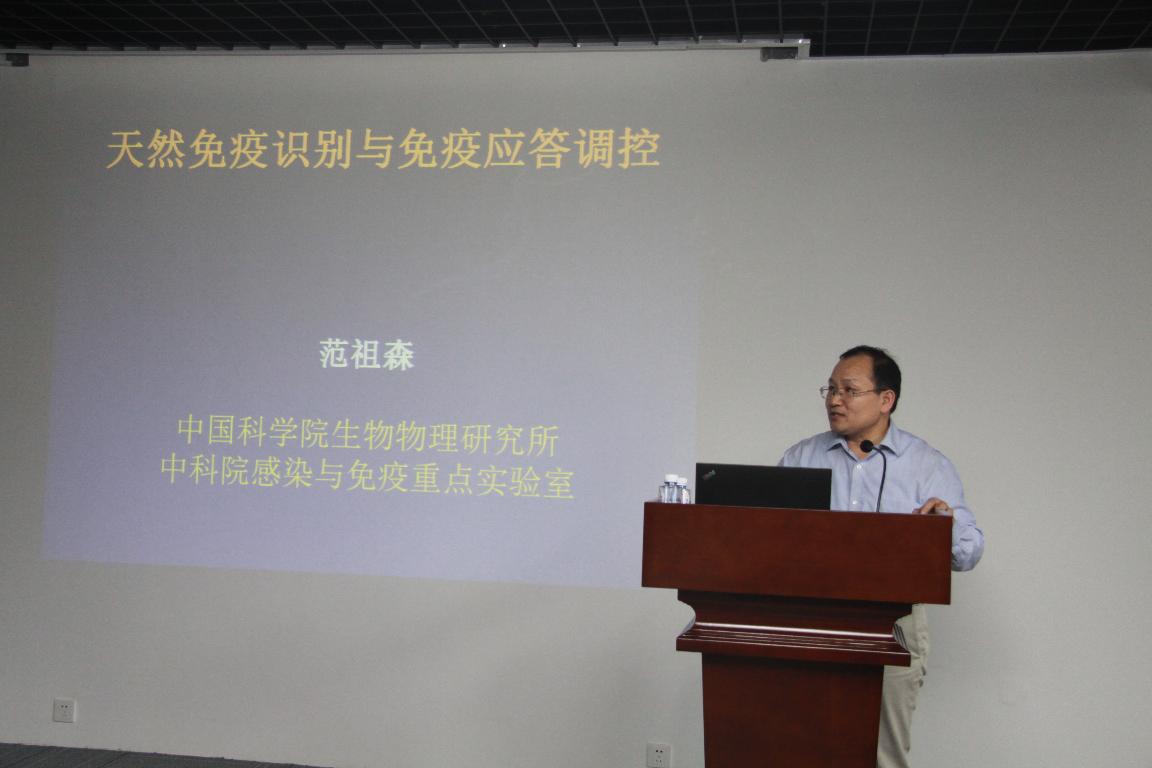 范祖森研究员首先为大家简要介绍了天然免疫信号通路的发现与发展,以及天然免疫识别自我和非我的信号转导机理。紧接着以肿瘤免疫学为研究主体,探索穿孔蛋白、颗粒酶等在自然杀伤细胞介导靶细胞凋亡中的作用。在肿瘤干细胞领域,范祖森研究员为大家讲解了转录因子Sox2调控mTOR信号通路以启动自噬的机制,以及其课题组发现的Sox2蛋白在激发机体的天然免疫反应,抵御病原微生物的感染中的重要作用。范祖森研究员还为大家讲述了血液细胞谱系建立的机制和骨髓巨核细胞生成、发育及成熟分化的分子机制,并指出了与机体巨核细胞成熟和血小板产生相关的胞内羧肽酶CCP6的缺陷可将导致机体易受DNA病毒的侵袭。整场讲座中,范祖森研究员以一种轻松幽默的口吻讲述了一个又一个的科学问题,并告诫大家在解决一些困难的科学问题时不仅要有过人的勇气与胆识,更要有十分耐心与坚持。讲座后范祖森研究员认真解答了现场师生们提出的问题,并围绕大家所关心的Sox2在嗜中性粒细胞中的细胞定位和功能展开了热烈讨论。讲座在热烈掌声中圆满结束。