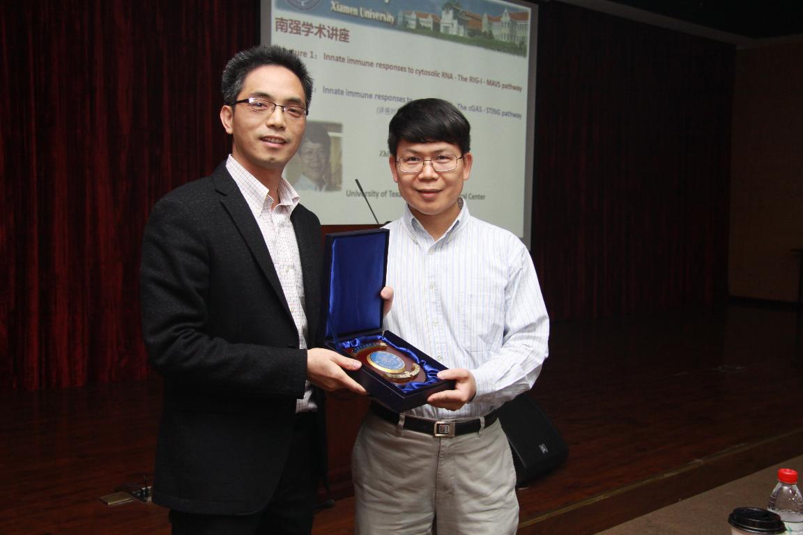 3月31日下午,美国国家科学院院士、美国德州大学西南医学中心分子生物学系终身教授、霍华德医学研究所研究员James Chen(陈志坚)教授在生命科学学院五楼学术报告厅,为我校师生带来了一场主题为“Innate immune responses to cytosolic RNA - The RIG-I - MAVS pathway”的南强学术讲座。生命科学学院副院长周大旺教授主持了本场讲座,并为陈志坚教授颁发了南强讲座纪念章。