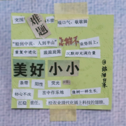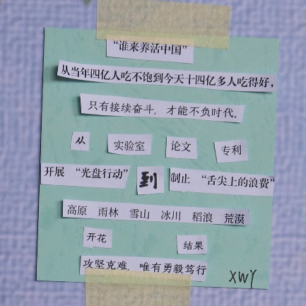 为深化政治理论学习成效,党支部还在理论学习之后开展了“耕耘诗行”拼贴诗创作环节。师生们从理论学习、科学家语录、科研实践等方面素材中汲取灵感,将“粮食安全”这一主题用情真意切的诗句表达出来。