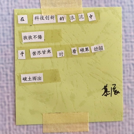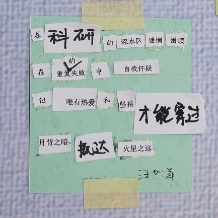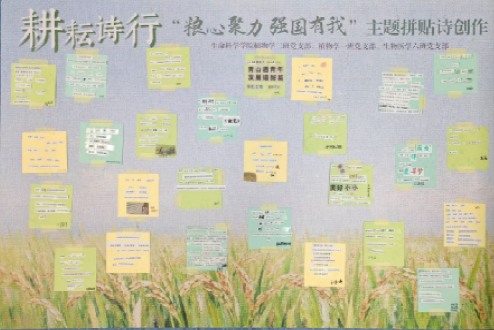 有的同学从科研攻坚的经历中凝练出“在科技创新的浪流中/孜孜不倦/于苦尽甘来时/看那硕果与幼苗破土而出”的诗意表达;有的同学则将宏大命题与科研使命相结合,创作出“从田野之广/禾下梦境/到银河之深/蓝图创新/中华民族伟大复兴的中国梦/正在劈波斩浪/攻坚克难中实现”的语句。“这次的拼贴诗让我把心中对粮食安全的愿景具象化了。”一位学生党员分享道,“它不只是一次创作,更是一次信念的凝聚。看到大家的诗句,我真切感受到那份属于中国人的家国情怀与独特浪漫。”