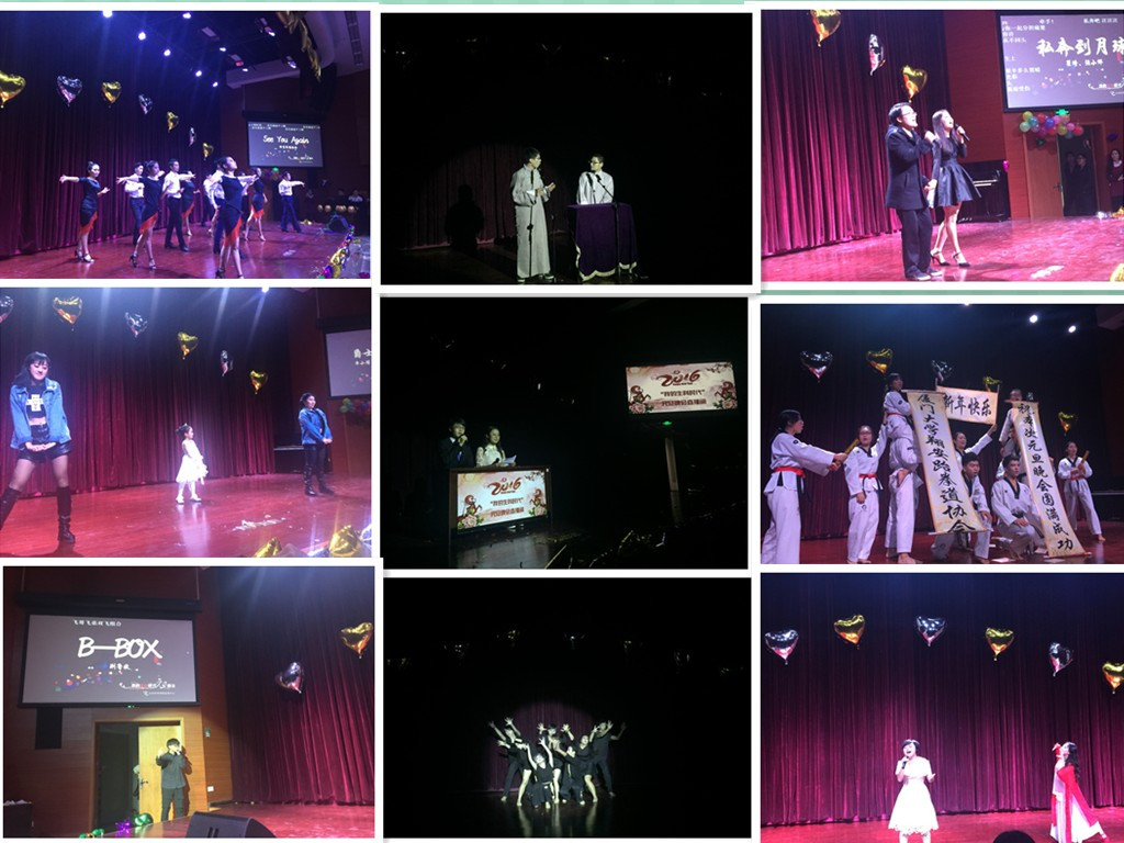 在活跃的氛围中,晚会进入第三个篇章。李博安老师高亢的声调伴随着悠扬的吉他声,一首《南山南》味道十足,直击人心;劲爆带感的舞姿,个性张扬的动作,街舞协会带来的《got me good》以专业的舞技征服观众;赵航,沈聪带来的相声《我是哲学家》表情到位,语气幽默,引来阵阵爆笑;体育舞蹈协会带来拉丁舞表演《see you again》,在柔美和火辣之间切换自如,技压全场。最后一次的砸金蛋环节更是融入了b-box的表演,荆鲁欣的高超口技令观众不禁跟着一起拍掌互动。
