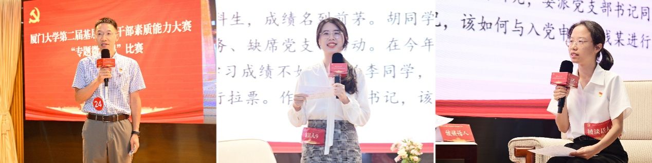 从“党务知识竞赛”和“主题党日策划”环节脱颖而出后,袁晶在“专题微党课”环节讲授了题为《教育强国,师者何为》的微党课,结合其研究领域和学科特色,分享了唐仲璋、唐崇惕“父女院士”等厦大寄生虫学三代科学家在为党育人、为国育才方面所开展的使命接力。在“现场谈心谈话”环节,肖宁双和钟君如两位队员面对强化党员责任意识、发展党员工作流程等常见的党务问题,以情景模拟的方式开展谈心谈话,展现出既坚持原则又注重方法的谈话技巧和工作本领,赢得了评委的一致好评。