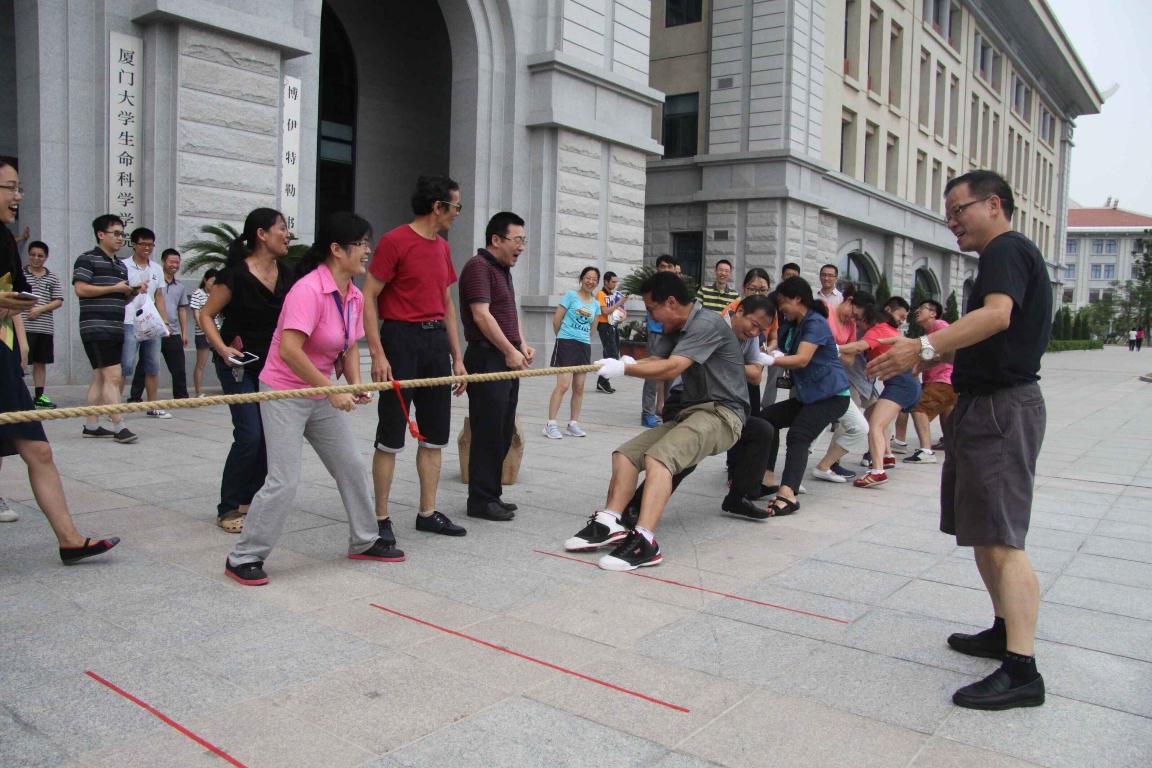 最后压轴的是拔河比赛,前两项比赛完成后,全院的教职工集合到学院大门口,摩拳擦掌开始准备拔河比赛。拔河比赛每个工会小组上场女生3名、男生5名。比赛一开始,呐喊声、加油声此起彼伏,正在拔河的两个队伍更是感受到团结的力量,“一二、一二、一二”,大家互相鼓励卯足了劲不服输,劲往一处使。经过激烈的比赛,最后学院办公室工会小组获得拔河冠军,生化与生物技术系工会和分析测试中心小组屈居2、3名。获胜的队伍大家开心地击掌庆贺着,惜败的队伍,大家互相握手鼓励着。不论输赢每个人脸上都洋溢着笑容,欢声笑语映着余晖撒满了黄朝阳楼。