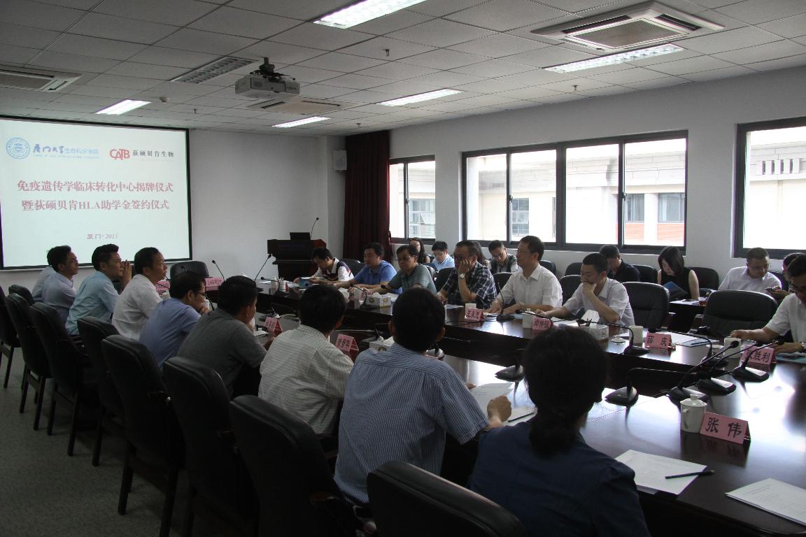 9月9日上午,由厦门大学生命科学学院、上海荻硕贝肯生物科技有限公司共同设立的“厦门大学生科院-荻硕贝肯免疫遗传学临床转化中心”在学院正式揭牌。厦门大学生命科学学院陈光书记、上海浦东新区商务委员会胡康华副主任共同为中心揭牌。上海浦东新区商务委员会、上海国际医学园区、上海陆家嘴金融贸易区管委会、上海浦东外商投资企业协会、上海航头招商中心等相关领导,上海荻硕贝肯生物有限公司郑仲征董事长等相关负责人,厦门大学科学技术处曾景华副处长,厦门大学生命科学学院林圣彩院长等党政领导班子及教授代表出席仪式。仪式由生命科学学院李博安副院长主持。