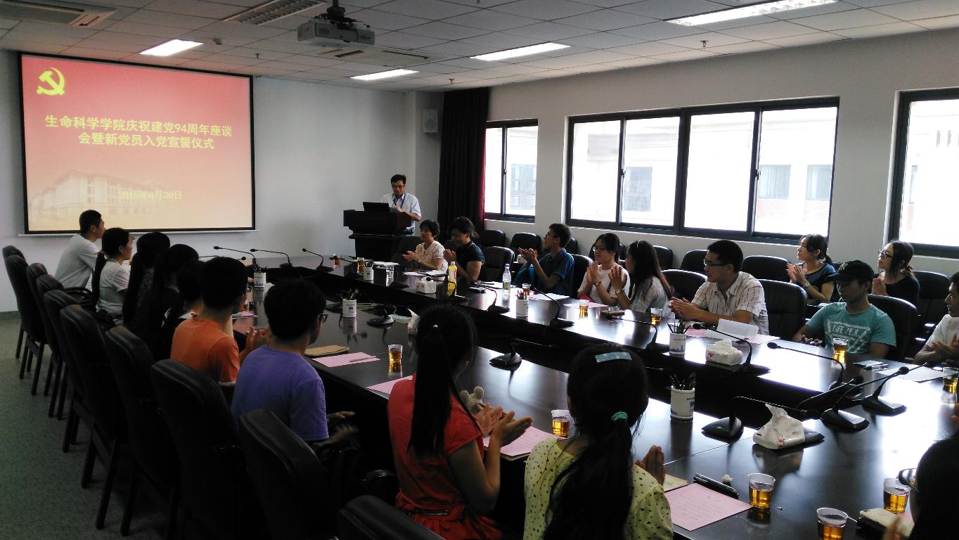 6月30日下午,生命科学学院在黄朝阳楼B403会议室召开庆祝建党94周年座谈会暨新党员入党宣誓仪式,学院党委副书记张伟、左正宏,党务秘书薛志平、团委副书记刘静,新党员参加了会议。会议由左正宏主持。