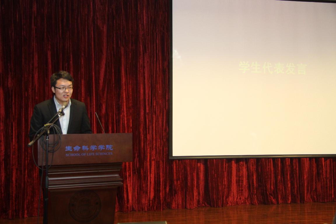 颁奖环节结束后,付国教授作为教师代表发言,付国老师的讲话深情而生动,赢得了同学们的阵阵掌声。他谈到了来到学院半年的一些感受,为学院近期老师和同学们取得的一系列好成绩感到骄傲,为学院崇尚科学与人文相结合的文化氛围而自豪,为来到一个积极向上而团结友爱的集体而感到欣慰。付国老师还通过许多生动的例子强调生命科学对人类生命健康发展的重要意义,勉励学子们生命科学的时代已经真正到来,希望同学们珍惜眼前得来不易的读书环境,为力争做一个大科学家而努力。