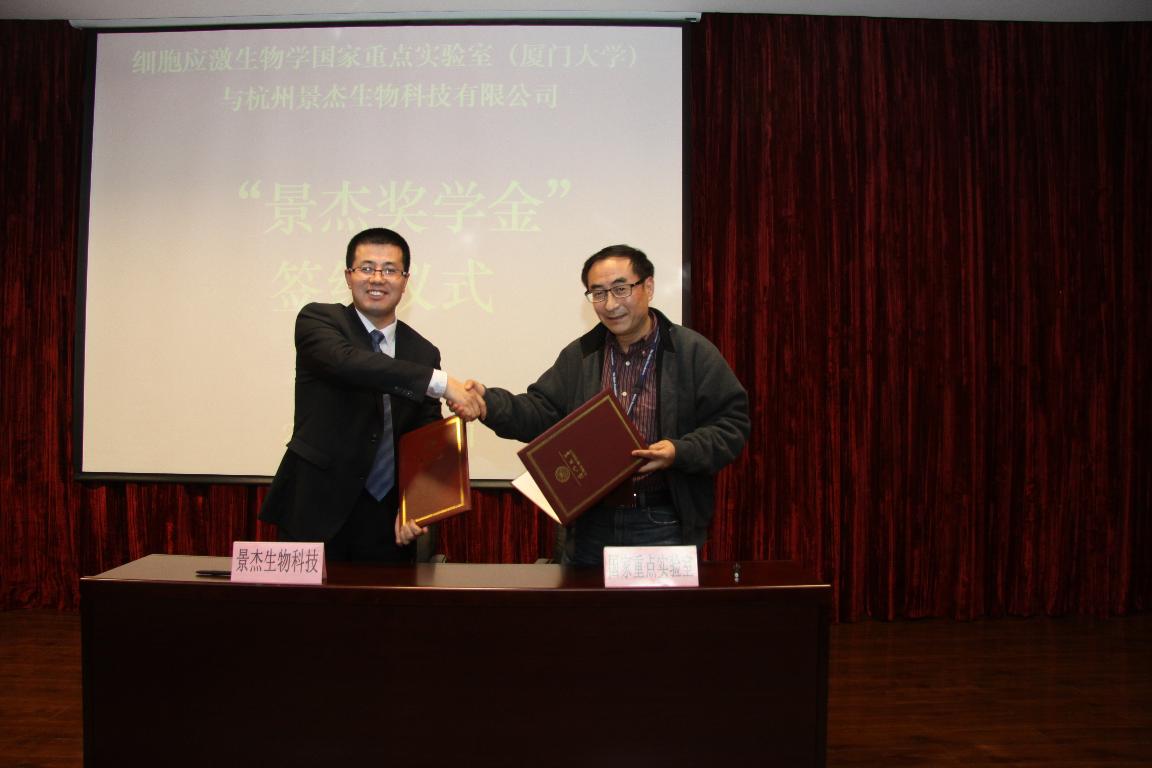 韩家淮教授与程仲毅博士分别代表本单位签订协议。协议明确了杭州景杰生物科技有限公司出资10万元人民币,面向厦门大学细胞应激生物学国家重点实验室全日制研究生专项设立“景杰奖学金”。协议签订后,程仲毅博士就设立“景杰奖学金”的初衷作了说明,奖学金设立的目的不在于“奖”而在于“学”,希望用公司微薄的力量,让中国本土培养的科学家们感受到来自本土企业的支持。韩家淮教授对景杰奖学金的设立表示由衷的感谢。