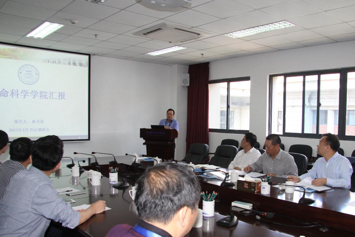 调研座谈会上,生命科学学院院长林圣彩向张彦介绍了学院的概况,汇报了近年来学院取得的代表性学术成果,以及学科建设、教学改革、学术交流、大型仪器平台建设等方面取得的进展。他强调,近期学院的工作重点是全力以赴做好“细胞信号网络协同创新中心”的培育建设和申报工作,并提出了需要学校解决的问题。生命科学学院党委书记陈光就基层党委如何完善内部治理结构,提高依法治院水平方面作了补充汇报,并就教师党建工作和人才队伍建设存在的问题提出了意见建议。