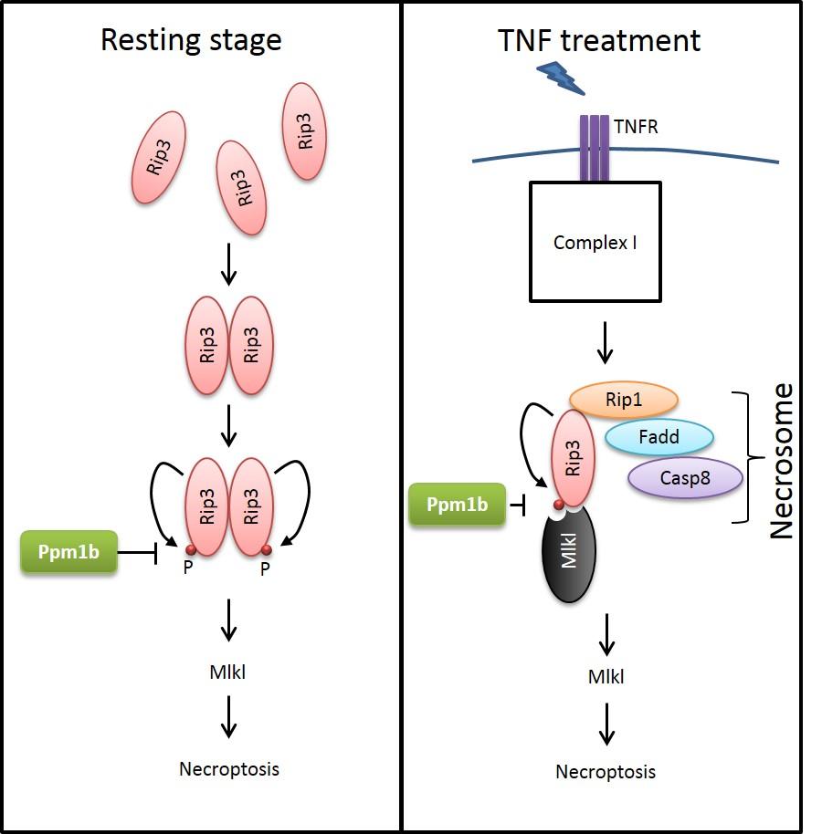 韩家淮教授课题组运用质谱技术分析RIP3免疫共沉淀复合体鉴定出了磷酸酶Ppm1b,第一次证实了RIP3的磷酸化状态是受到细胞精确调控的。该研究发现,在细胞没有受到信号刺激的情况,Ppm1b通过和RIP3的相互作用抑制RIP3的自激活从而促进细胞存活;在受到程序性坏死因子刺激下,Ppm1b通过去磷酸化Rip3从而抑制程序性细胞坏死。进一步研究发现,在肿瘤坏死因子诱导的全身炎症反应综合征的小鼠模型中,Ppm1b能够通过去磷酸化RIP3从而减少小鼠的盲肠损伤并提高小鼠的存活率。由此可见, RIP3磷酸化状态的精确调控对于细胞和机体在生理和病理状态下的存活至关重要。该研究结果为我们治疗由于过量分泌肿瘤坏死因子导致的全身炎症反应综合征提供了一个全新视觉,对于治疗该疾病有这重要的意义。