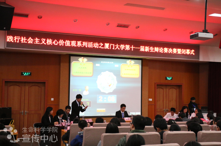 12月21日15时,厦门大学第十一届新生辩论赛总决赛暨闭幕式在思明校区化学报告厅举行。对战双方是正方人文学院和反方生命科学学院,两方就“人类的科技已经过度/尚未足够”这一辩题展开激烈的辩论,最终生命科学学院技高一筹,摘得桂冠。