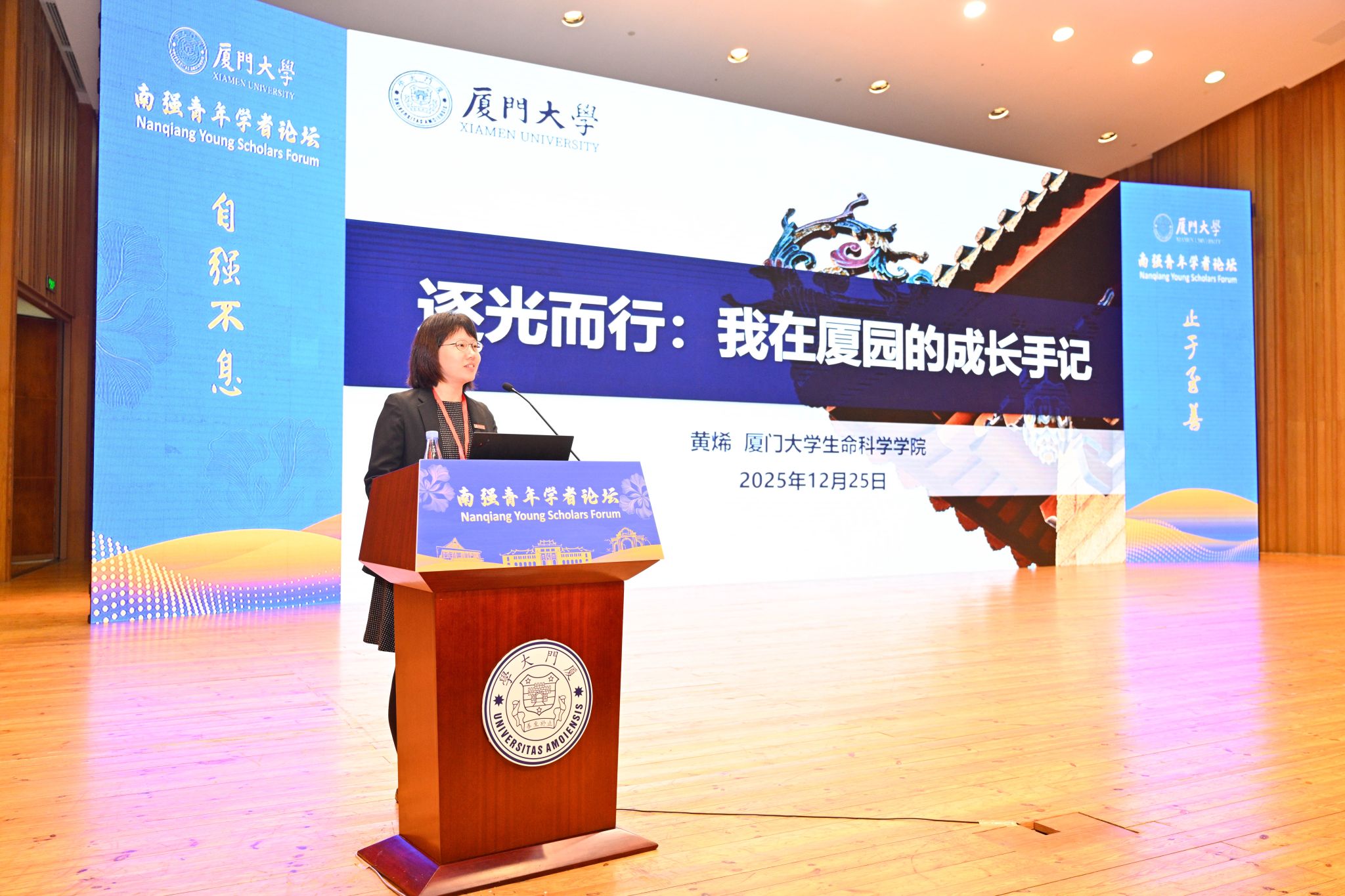 在12月25日的学校主论坛,黄烯应邀作为高层次人才代表,做题为《逐光而行:我在厦园的成长手记》的报告,为全体参会学者分享了来校工作生活的经验与感触。