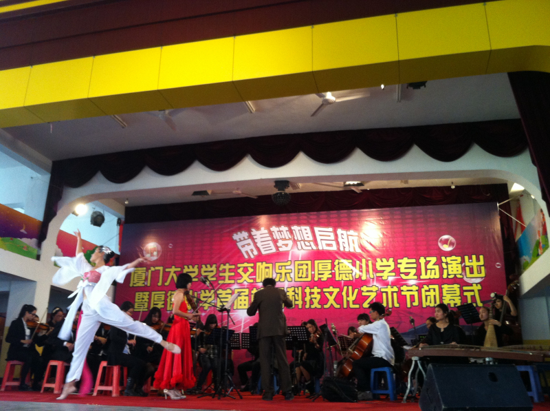 2013年11月19日下午,在厦门大学生命科学学院、厦门大学团委和厚德学园的共同牵线下,厦门大学学生交响乐团赴泉州南安厚德小学举行《梁祝》专场演出。据悉,这样大规模的交响乐进校园义演在泉州市还是第一次,意义非凡,演出受到了厚德小学全体师生的热烈欢迎。演出第二天,泉州晚报、东南早报、南安电视台、南安商报、石井要闻等媒体就做了跟踪报导。