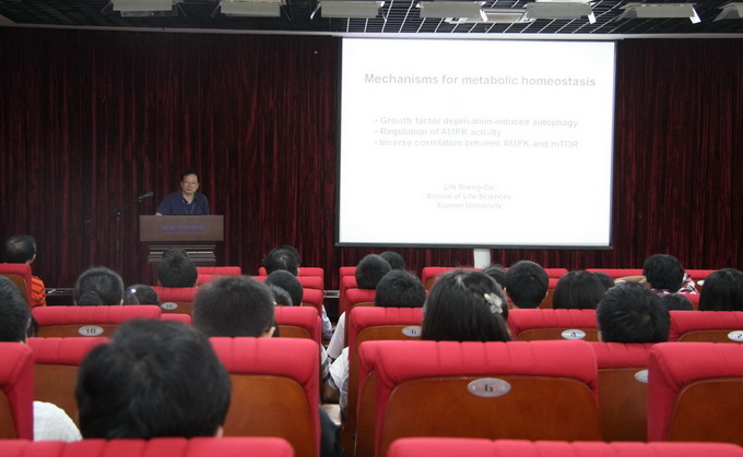 学术报告上林圣彩教授向师生介绍了其课题组的重大研究发现细胞“饥饿”信号传导通路中的关键一环:林圣彩教授多年来的研究对象——名为AXIN的蛋白作为一个桥梁,将低能量分子AMP结合的AMPK和其上游激酶LKB1连接在一起,三者形成一个复合体,促进LKB1对AMPK的磷酸化激活,使得AMPK的活性升高,从而完成信号传递过程。