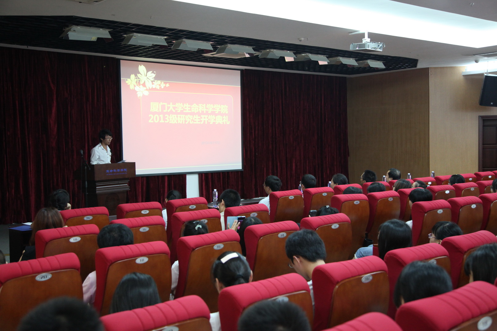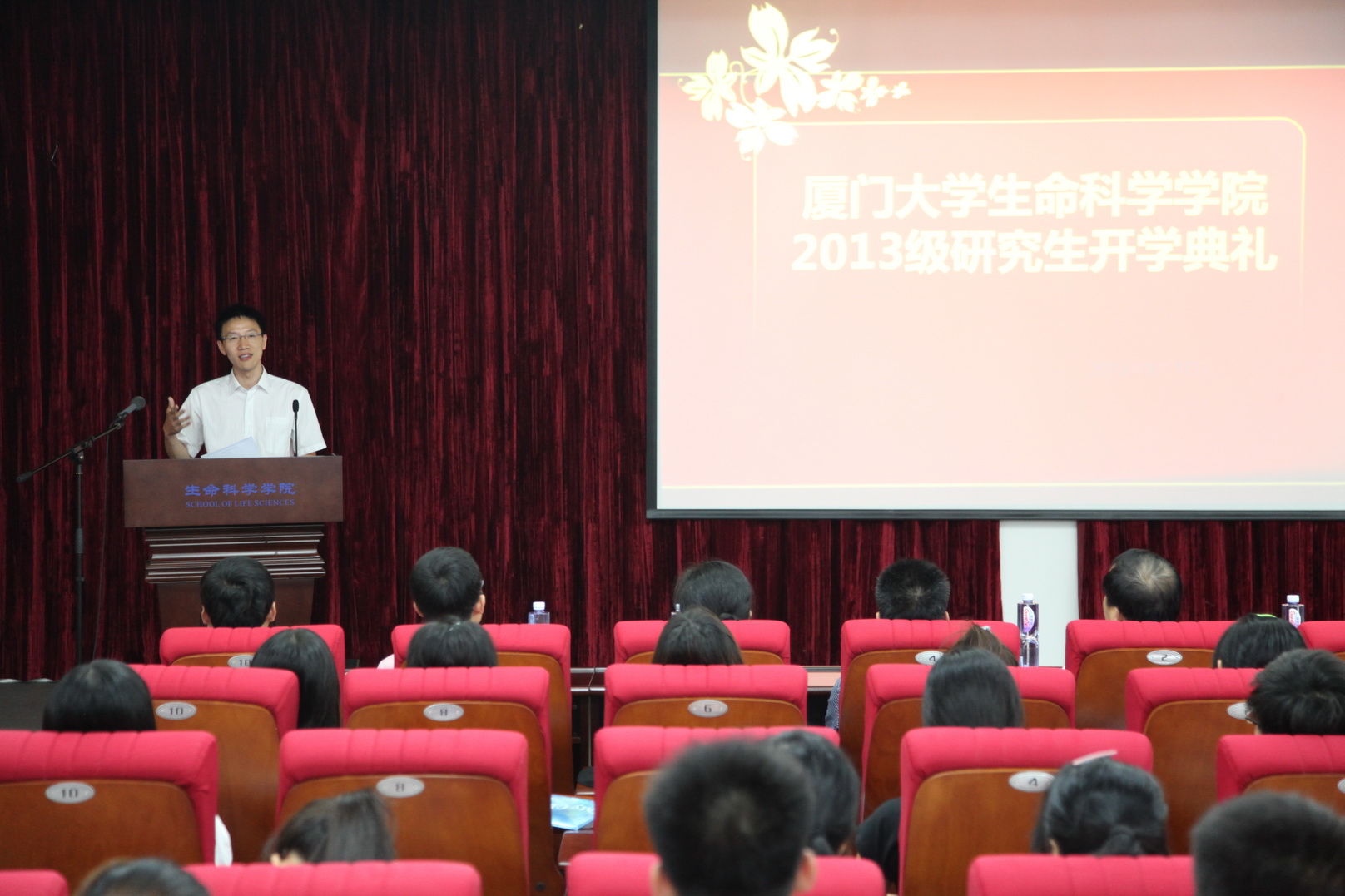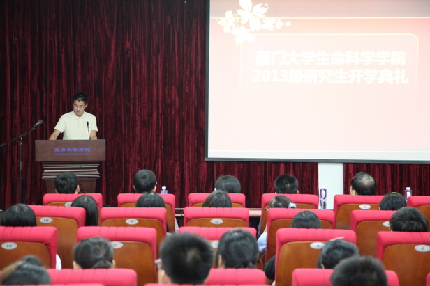 2013年9月17日下午3点,厦门大学生命科学学院2013级研究生开学典礼在黄朝阳楼B栋学术报告厅隆重举行。学院党委书记陈光老师、副院长欧阳高亮老师、副院长周大旺老师、党委副书记张伟老师、教师代表袁晶老师、全体辅导员、研究生教学秘书,以及来自全国各地的近220名研究生新生参加了本次开学典礼。典礼由学院党委副书记左正宏老师主持。