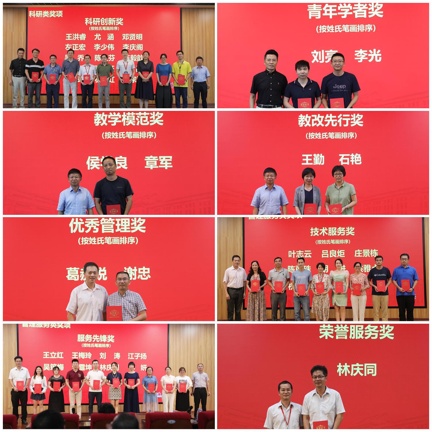 为表彰先进、鼓舞斗志、弘扬典型,激发全院教职员工干事创业、创先争优,我院举行了2020-2021年度奖教金颁奖仪式。大会授予夏宁邵教授杰出贡献奖,表彰其为学院发展做出的突出贡献。随后,大会颁发了科研创新奖、青年学者奖、教学模范奖、教改先行奖、优秀管理奖、服务先锋奖、技术服务奖以及荣誉服务奖,共42位教职员工受到表彰。最后,举行荣誉退休仪式,全场以热烈的掌声感谢袁立、林天伟、阮艳三位老师多年来为学院做出的贡献。至此教职工大会圆满落幕。