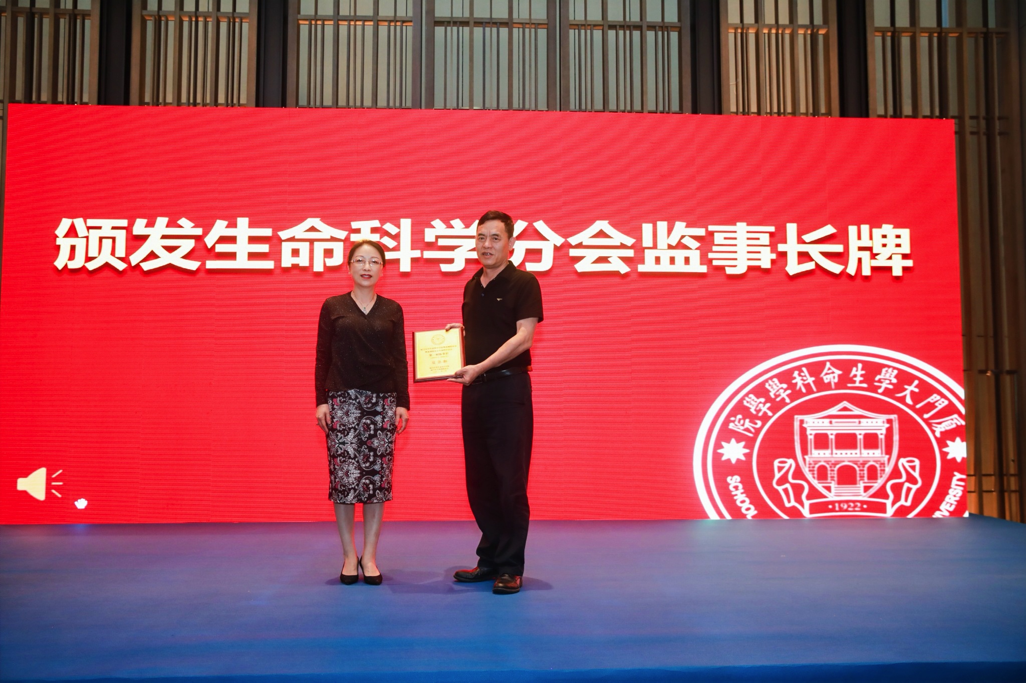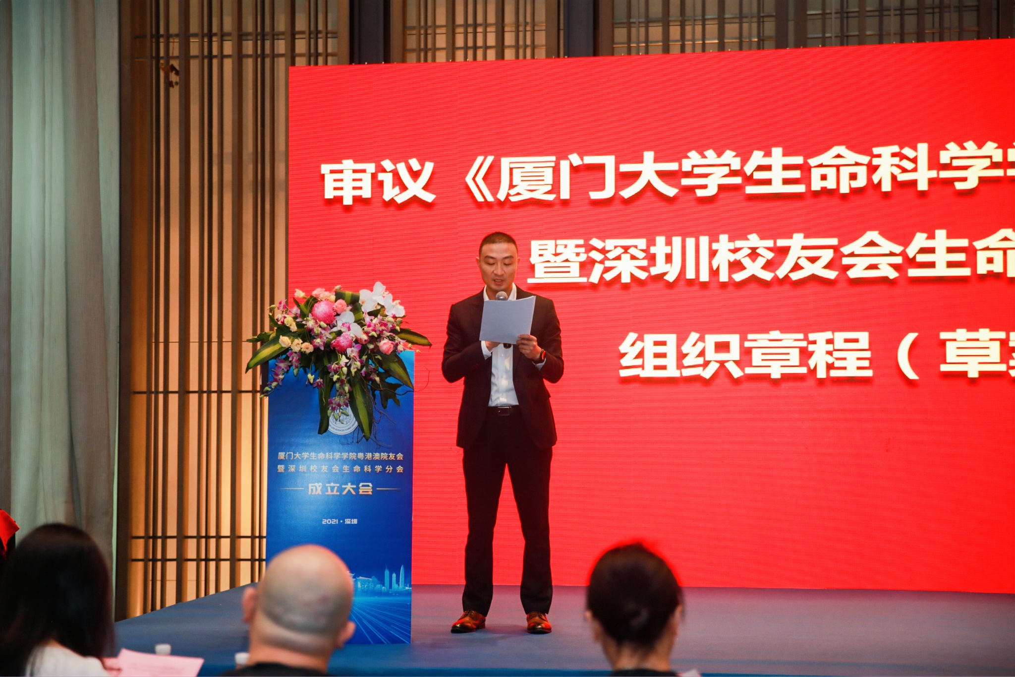 厦门大学深圳校友会理事长孙小荔女士宣读《厦门大学深圳校友会关于成立厦门大学生命科学学院粤港澳院友会暨深圳校友会生命科学分会的决定》,随后大会审议并一致通过了《厦门大学生命科学学院粤港澳院友会暨深圳校友会生命科学分会组织章程(草案)》,审议并选举了第一届理事会理事长、监事长、副理事长、秘书长等,由1996级院友崔鹏任首任理事长,1978级院友夏念和任首任监事长,1997级院友朱子恒任首任秘书长。