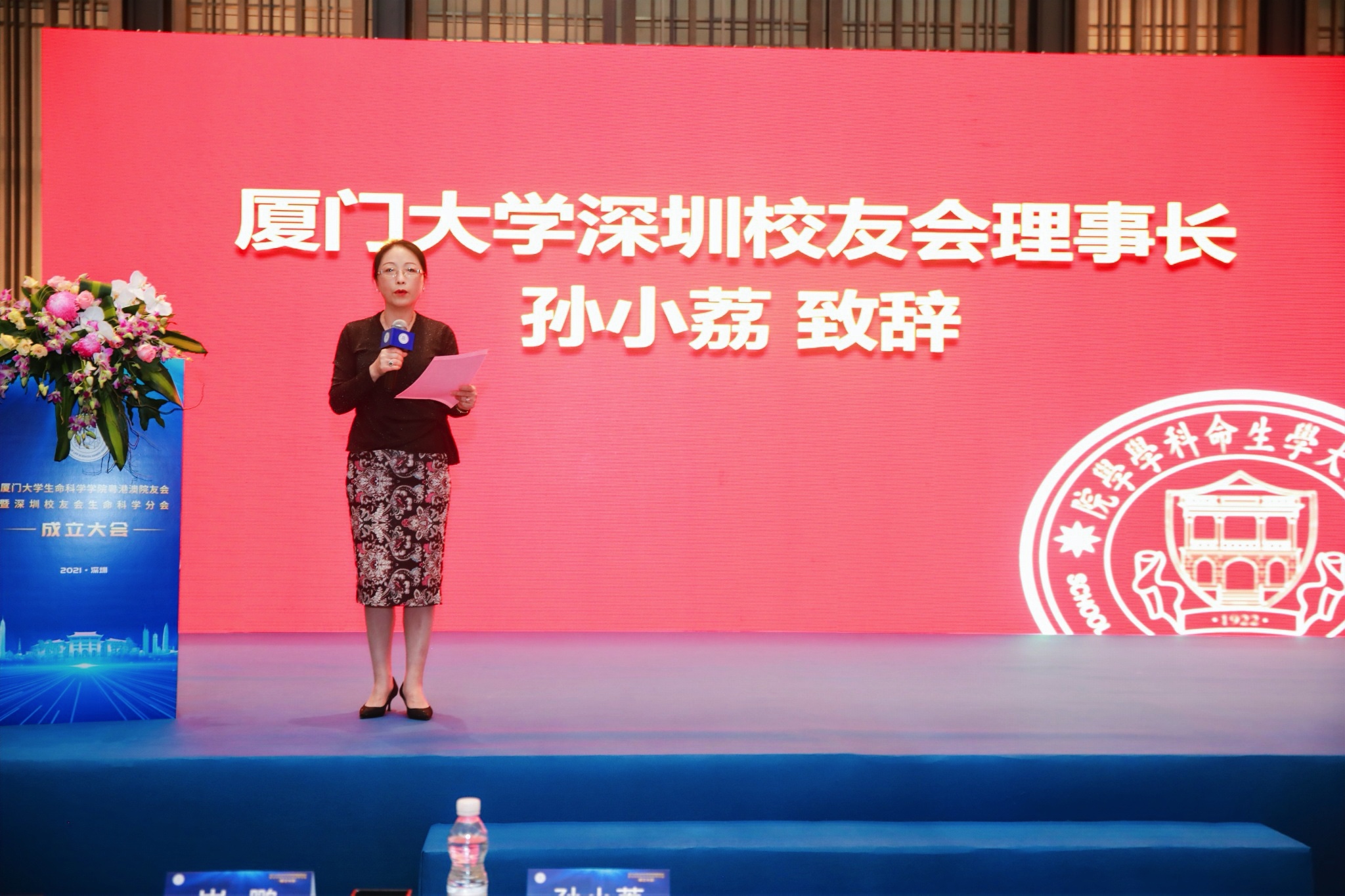厦门大学深圳校友会理事长孙小荔致辞,在致辞中感谢了崔鹏校友为深圳校友会“箪食瓢饮 衔环涌泉”项目做出的重要贡献,积极响应并认捐一年费用666万元用于资助“学生免费白米饭及矿泉水”经费开支。她相信,崔鹏校友一定可以带领好生命科学学院粤港澳院友会暨深圳校友会生命科学分会,将分会越办越好,以实际行动践行厦大的捐赠文化与嘉庚精神,为学校学院百年做出新的更大贡献。