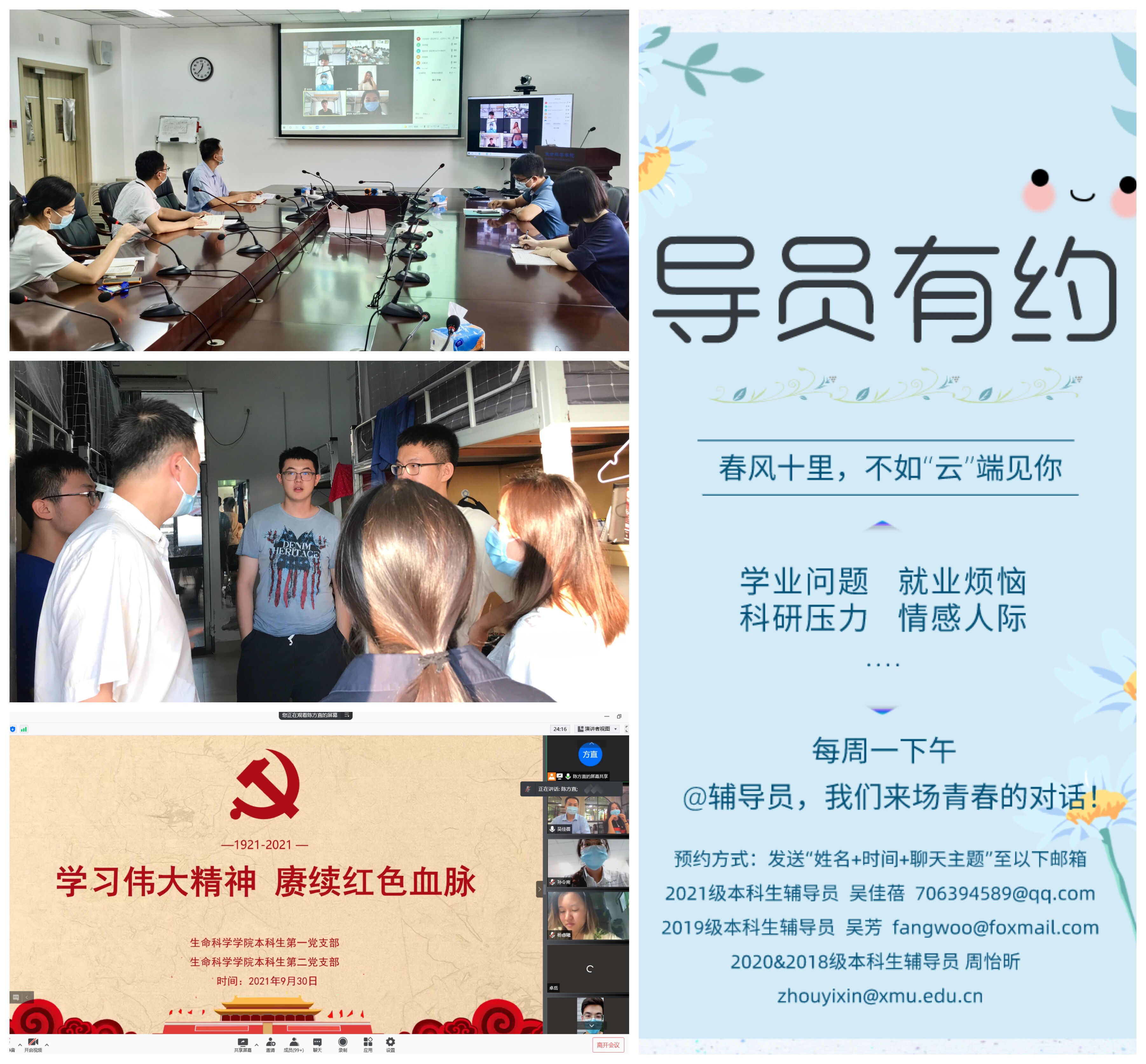 疫情打乱了师生的学习生活节奏,学院党委想师生所想,解师生所难,把疫情防控与“我为师生办实事”实践活动有机结合,做到主动作为、守土尽责。疫情期间,在校学生实行线上上课,学院教师、教学秘书做好充分准备,全力保障线上教学顺利开展,加强线上远程辅导。新生军训因疫情延期,学院发挥优秀学生党员、团员力量,开展线上“学在生科”经验分享系列讲座,保障新生“停训不停学”。学院数位学生根据疫情防控要求入住健康观察区,学院领导、辅导员与学生进行“云端”连线,了解学习生活情况,询问困难需求,并送上个性化定制的“中秋大礼包”。所有辅导员入住学生宿舍,将办公场所前移学生社区,定期走访学生宿舍,开展谈心谈话,宣传与落实疫情防控相关政策。关注学生疫情期间思想动态和学习生活状况,辅导员驻楼期间进一步加强防范网络诈骗宣传教育、垃圾分类教育、劳动教育和爱国卫生教育,密切关注学生心理状况,线上开展“学习伟大精神,赓续红色血脉”党支部学习分享会,与当下疫情相结合,为同学们上了一堂思政大课。
